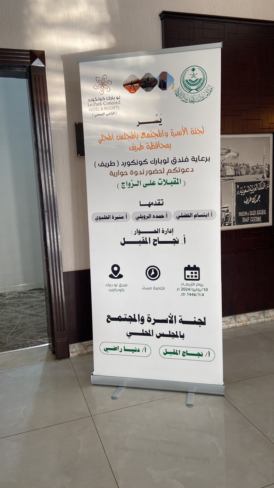 أقامت لجنة الأسرة والمجتمع بالمجلس المحلي بمحافظة طريف ممثلةً بالأستاذة :نجاح المقبل والأستاذة: دنيا الرويلي ندوة حوارية بعنوان "المقبلات على الزواج "،في قاعة فندق لوبارك كونكورد الراعي الرسمي لهذه الندوة