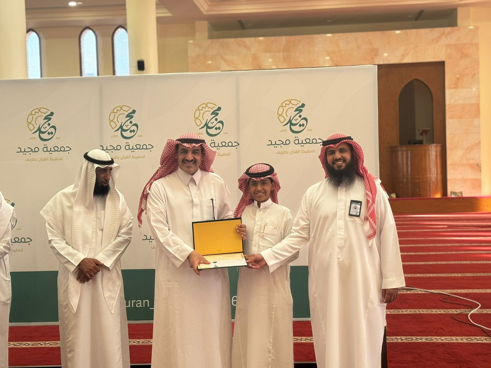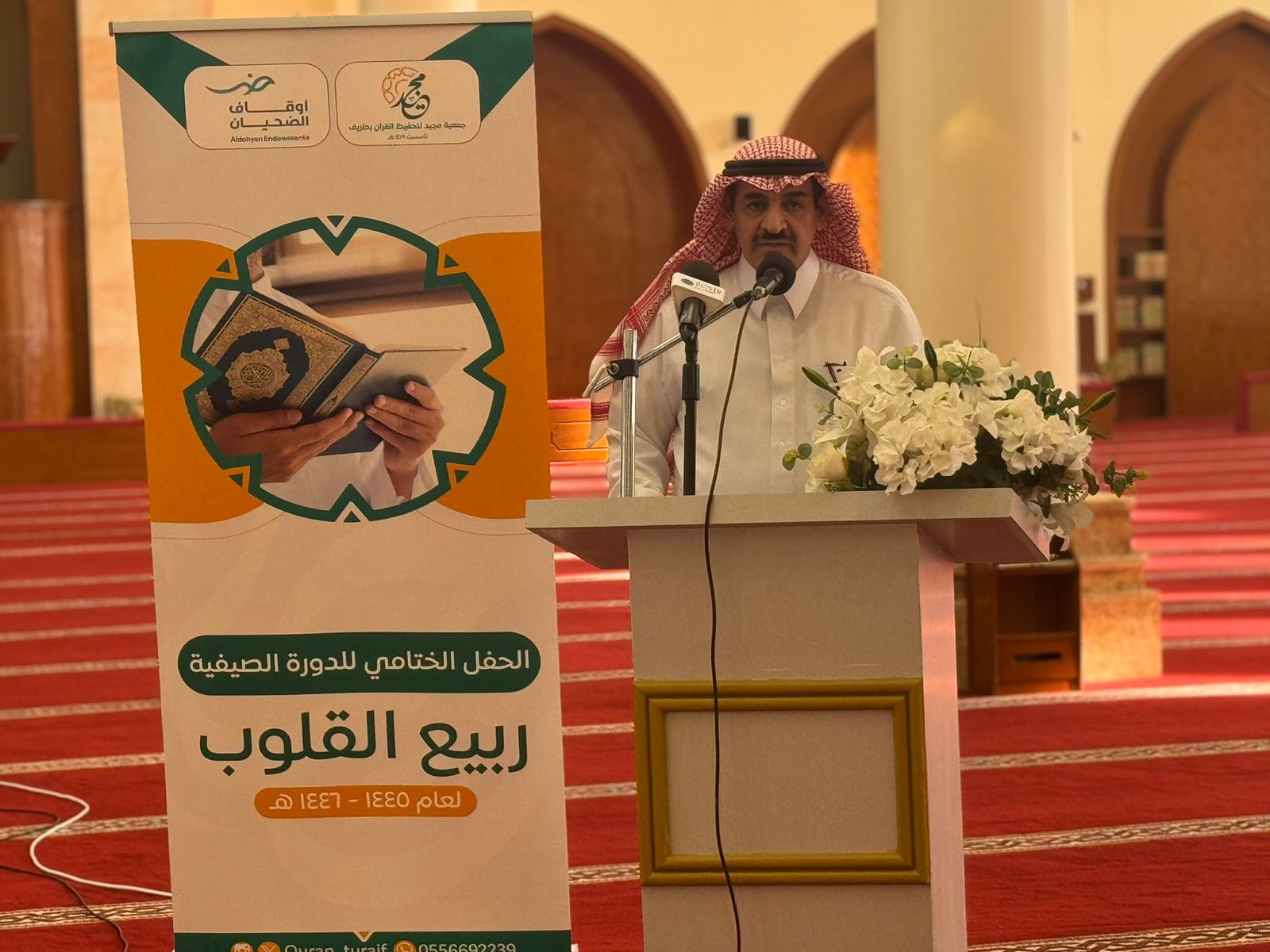 أقامت جمعية مجيد لتحفيظ القرآن الكريم بطريف الحفل الختامي للدورة الصيفية (ربيع القلوب) لعام ١٤٤٦ه على شرف سعادة محافظ محافظة طريف الأستاذ /بدر بن نجر الصقر وسط حضور من قبل الطلاب وأولياء الأمور وبعض أعيان المحافظةK حيث بدأ الحفل بتلاوة عطرة للطالب / يوسف ليلي الهزيمي