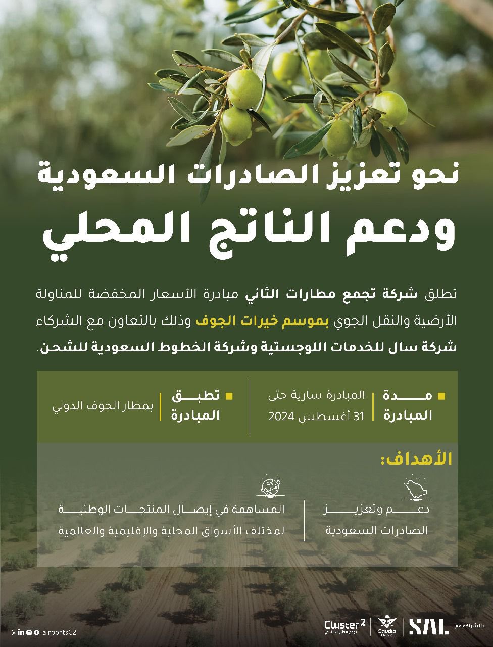 استكمالاً لمساعي شركة تجمع مطارات الثاني في تعزيز الصادرات السعودية ودعم الناتج المحلي تم إطلاق مبادرة الأسعار المخفضة لخدمة المناولة الأرضية والنقل الجوي بالتعاون مع الشركاء، شركة سال للخدمات اللوجستية وشركة الخطوط السعودية للشحن من خلال مطار الجوف الدولي،وذلك خلال موسم "خيرات الجوف" بمدينة سكاكا