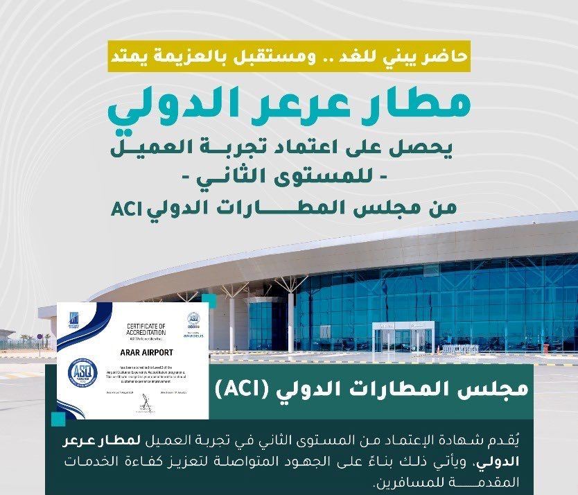 حصل مطار عرعر الدولي على شهادة اعتماد تجربة العميل (المستوى الثاني) من مجلس المطارات الدولي (ACI)، وذلك في خطوة تعكس الجهود المتواصلة لتعزيز كفاءة الخدمات المقدمة للمسافرين، والعمل على تحسين التجربة العامة للمسافرين من خلال تطوير إستراتيجيات وتجارب متميزة.
