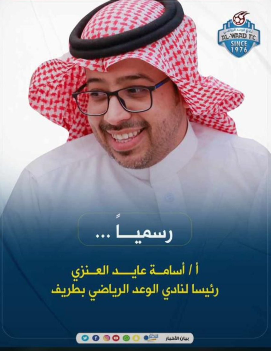 عقدت الجمعية العمومية لنادي الوعد بمحافظ طريف مساء السبت 24-2-2024 بحضور الأستاذ يزيد الجريسي عضو اللجنة المنظمة لانتخابات الأندية الرياضية والأستاذ فرج الهزيمي مندوب فرع وزارة الرياضة بمنطقة الحدود الشمالية ، وبحضور أعضاء الجمعية العمومية ، إذ تم تنصيب الأستاذ أسامة عايد العنزي رئيساً للنادي بالتزكية لمدة أربعة أعوام ، ويضم مجلس الإدارة في دورته الجديدة عضوية كل من : الأستاذ جمال ضحوي العنزي نائباً للرئيس ، الأستاذ محمد ثاني الرويلي ، الأستاذ : فايز عرنان العنزي ، الأستاذ عايد منور العنزي .