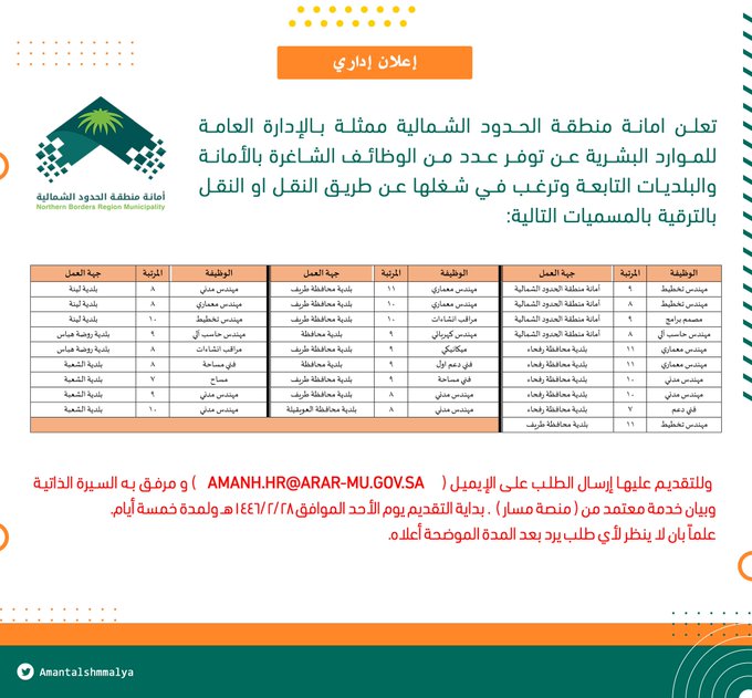 تعلن أمانة منطقة الحدود الشمالية ممثلة بالإدارة العامة للموارد البشرية عن توفر عدد من الوظائف الشاغرة بالأمانة والبلديات التابعة لشغلها عن طريق النقل او النقل بالترقية حسب البيان المرفق .