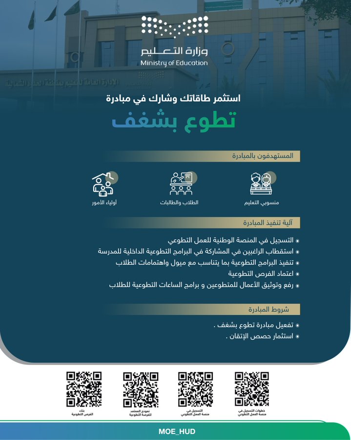 أطلقت الإدارة العامة للتعليم بمنطقة الحدود الشمالية أكثر من (84) فرصة تطوعية في المنصة الوطنية للعمل التطوعي .