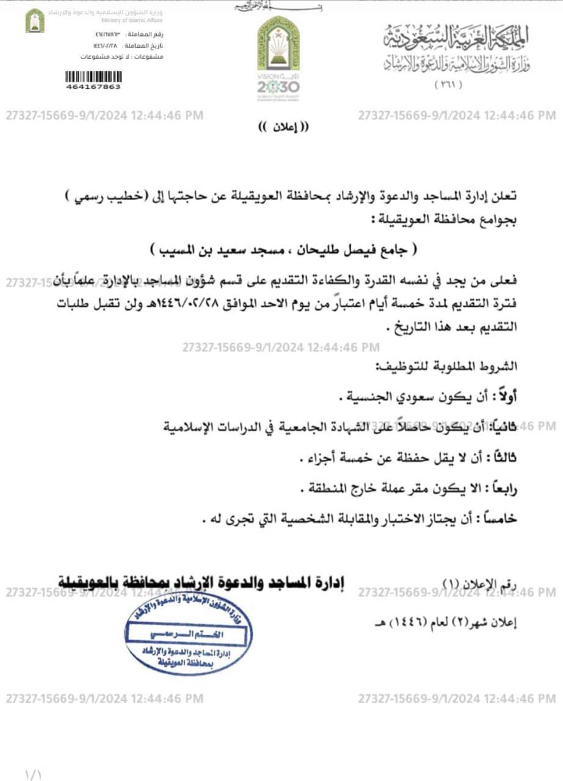 أعلنت إدارة المساجد والدعوة والإرشاد بمحافظة العويقيلة عن حاجتها في توظيف خطيب رسمي في ( جامع فيصل طليحان ، مسجد سعيد بن المسيب ) وخطيب متعاون في الهجر التابعة لمحافظة العويقيلة في كلاً من ( الكاسب ، نعيجان ) .