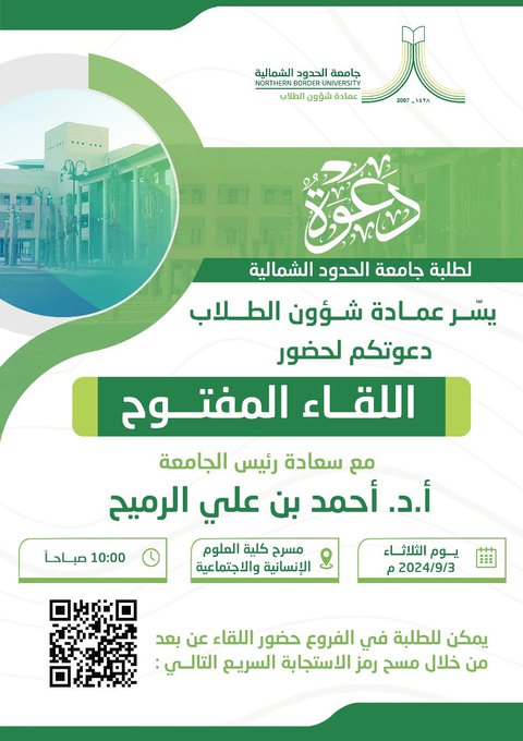 برعاية سعادة رئيس جامعة الحدود الشمالية أ.د.أحمد بن علي الرميح؛ تنظم عمادة شؤون الطلاب اللقاء المفتوح لطلبة الجامعة، على مسرح كلية العلوم الإنسانية والاجتماعية.
