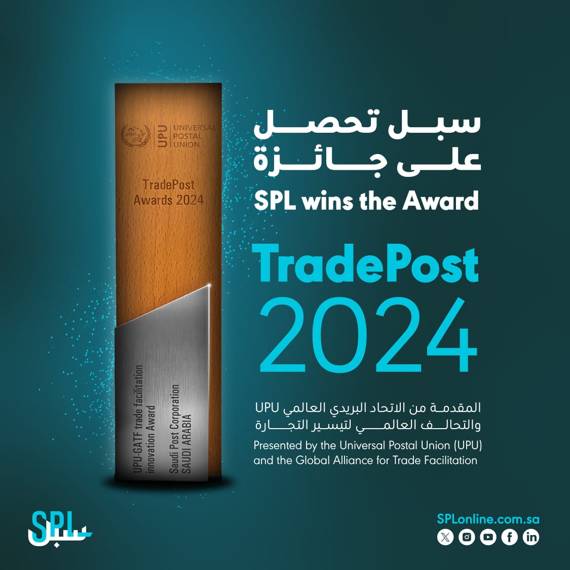 حصلت سبل على جائزة TradePost 2024 العالمية المقدمة من الاتحاد البريدي العالمي والتحالف العالمي لتيسير التجارة وذلك عن مشروعها Prepaid SMEs platform المخصص لدعم المؤسسات الصغيرة والمتوسطة، وتمكينها بتسهيل أعمالها من خلال الممكنات اللوجستية التي تقدمها سبل.