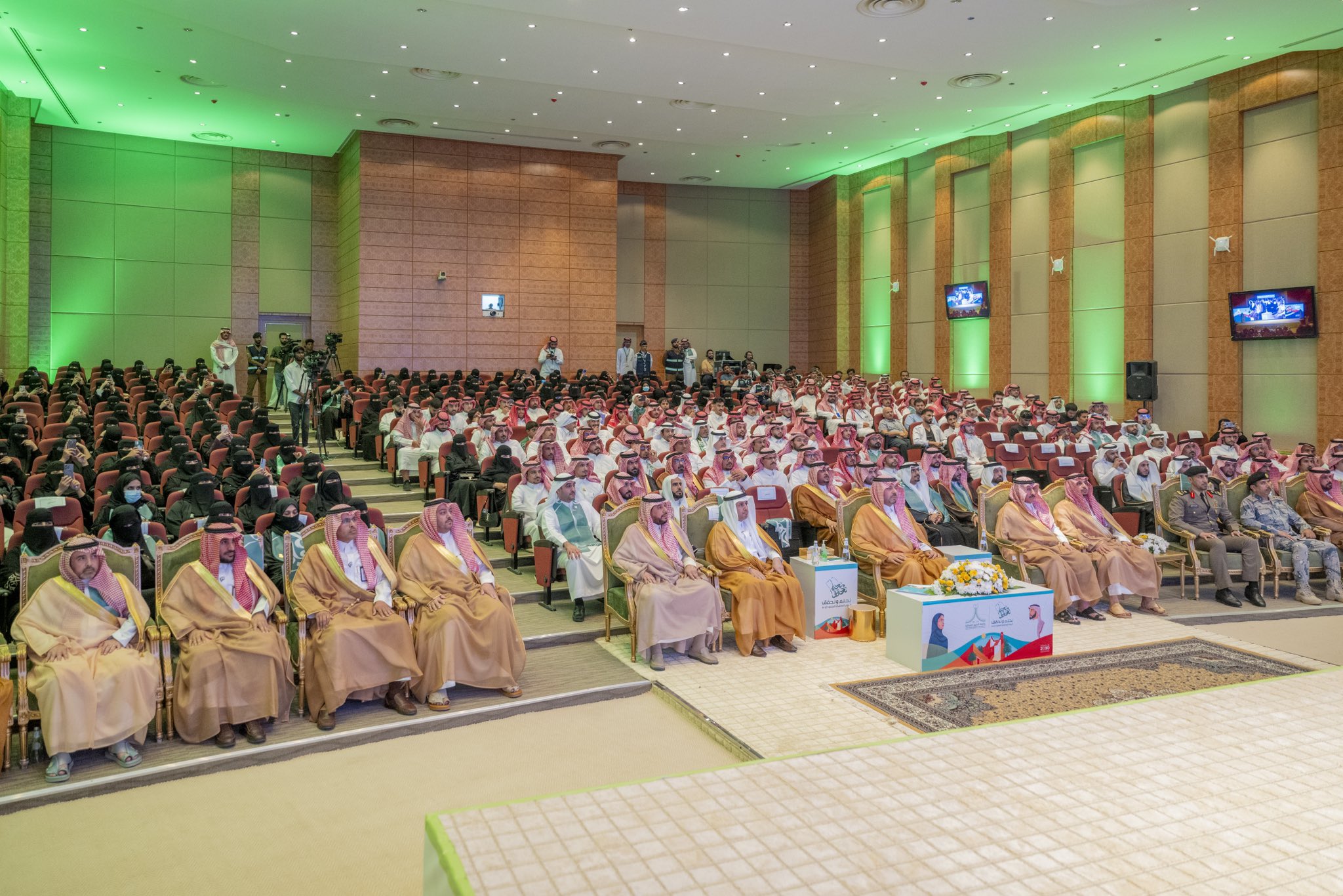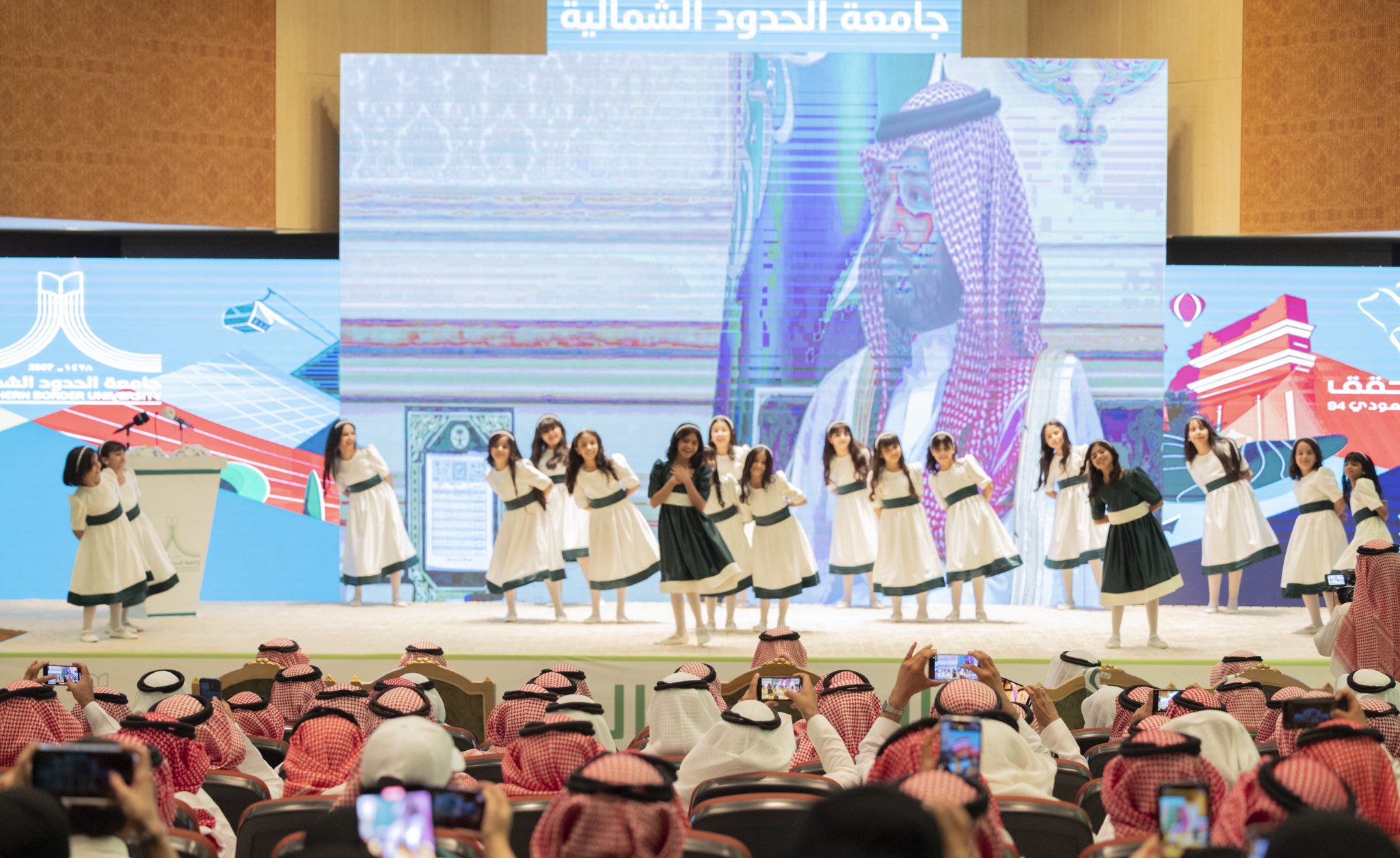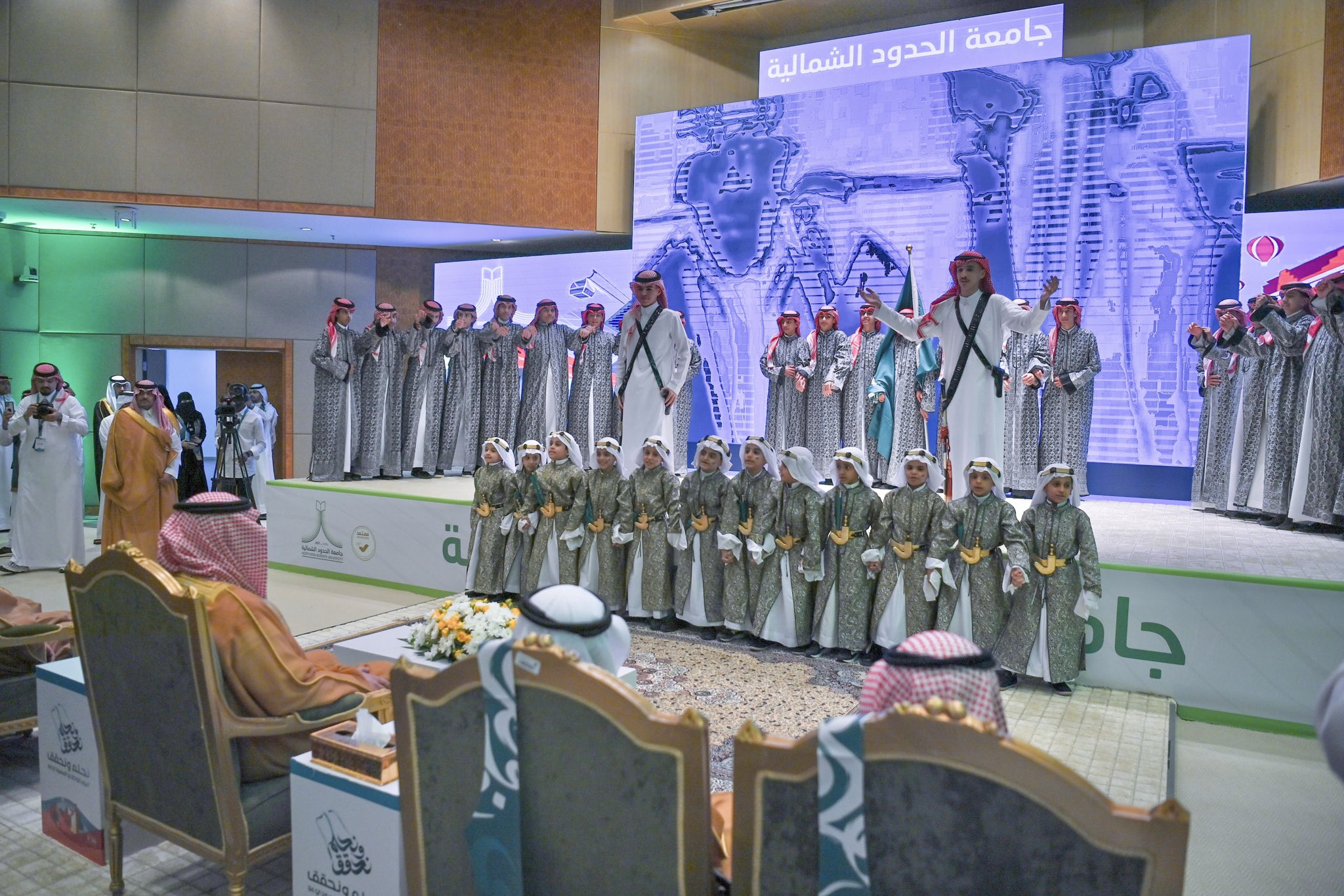 بعد ذلك، شاهد الحضور عرضًا مرئيًا عن تطور التعليم بالمملكة واهتمامها بمؤسسات التعليم ونشأته في المنطقة, ثم ألقيت قصيدة شعرية، تلاها أوبريت وطني قدمه طلاب جامعة الحدود الشمالية.