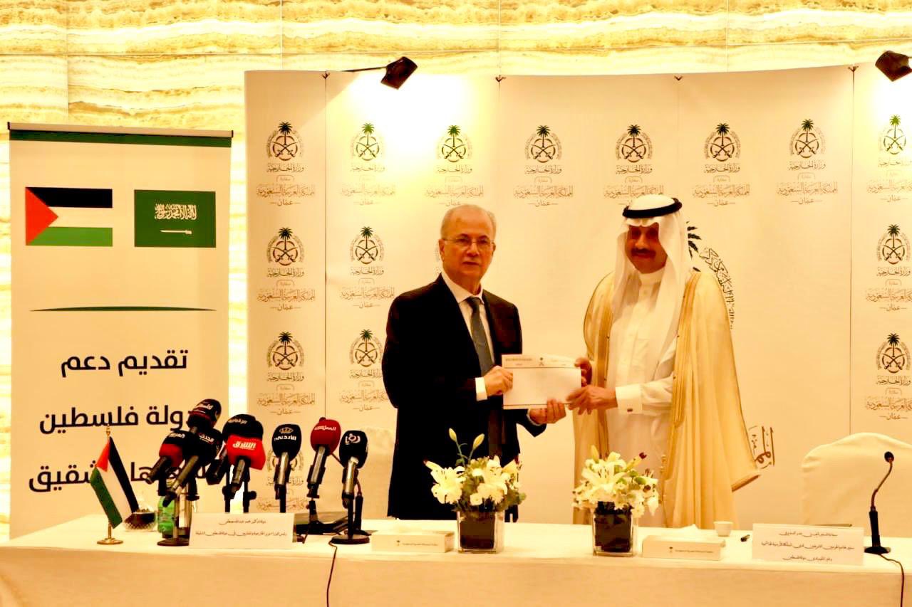 سلّم سفير خادم الحرمين الشريفين لدى الأردن غير المقيم لدى دولة فلسطين القنصل العام في القدس نايف بن بندر السديري، بمقر السفارة اليوم، رئيس وزراء دولة فلسطين الدكتور محمد مصطفى، الدعم المالي الشهري للأشقاء في فلسطين للمساهمة في معالجة الوضع الإنساني في قطاع غزة ومحيطها.