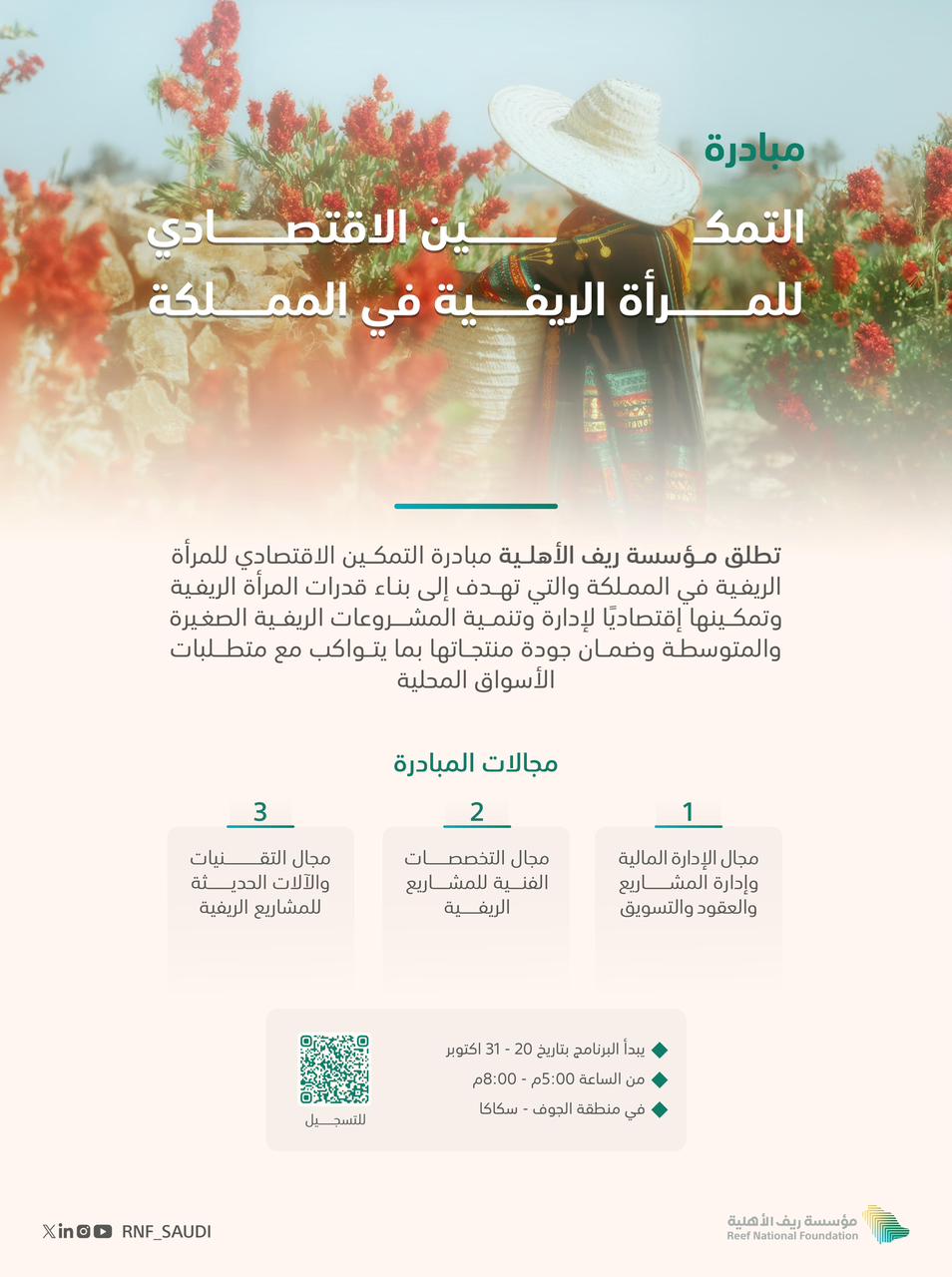 اقامت اليوم مؤسسة ريف الاهلية احد مبادرات التمكين الاقتصادي للمرأة والتي تهدف الى بناء قدرات المرأة الريفية وتمكينها إقتصادياً لإدارة وتنمية المشاريع الريفية الصغيرة والمتوسطة وضمان جودة منتجاتها بما يتواكب مع متطلبات الاسواق المحلية بحضور مديرة المبادرة الاستاذة : سديم الرميح كما تتناول المبادرة عدة مجالات منها الادارة المالية وادارة المشاريع والتخصصات الفنية للمشاريع الريفية ومجال التقنيات والالات الحديثة للمشاريع الريفية وتركز مبادرة التمكين الاقتصادي للمرآه الريفية على بناء قدرات الممارسات السعوديات في مجالات التنمية الريفية