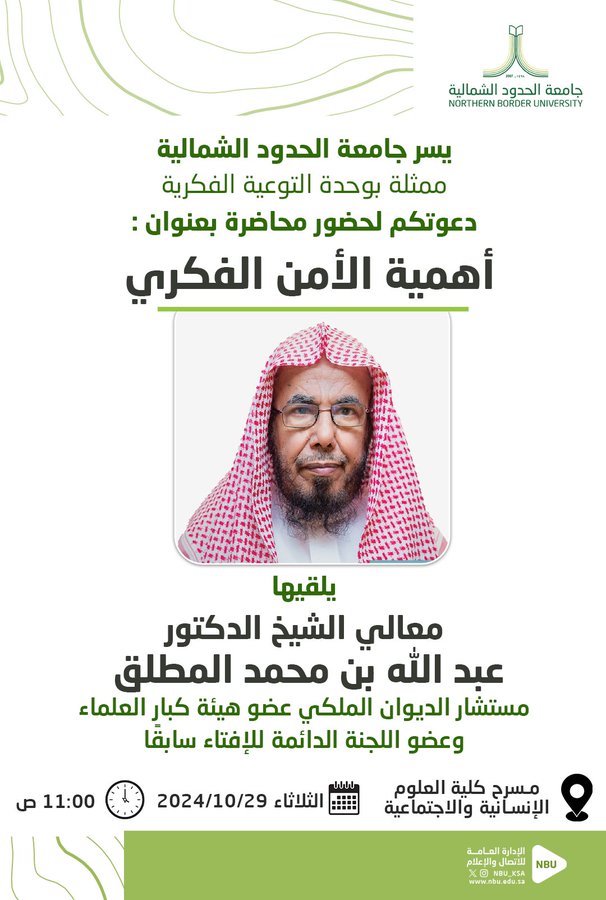 تقيم جامعة الحدود الشمالية ممثلةً بوحدة التوعية الفكرية؛ محاضرة بعنوان: "أهمية الأمن الفكري"، يلقيها معالي الشيخ الدكتور/ عبدالله بن محمد المطلق، عضو هيئة كبار العلماء.