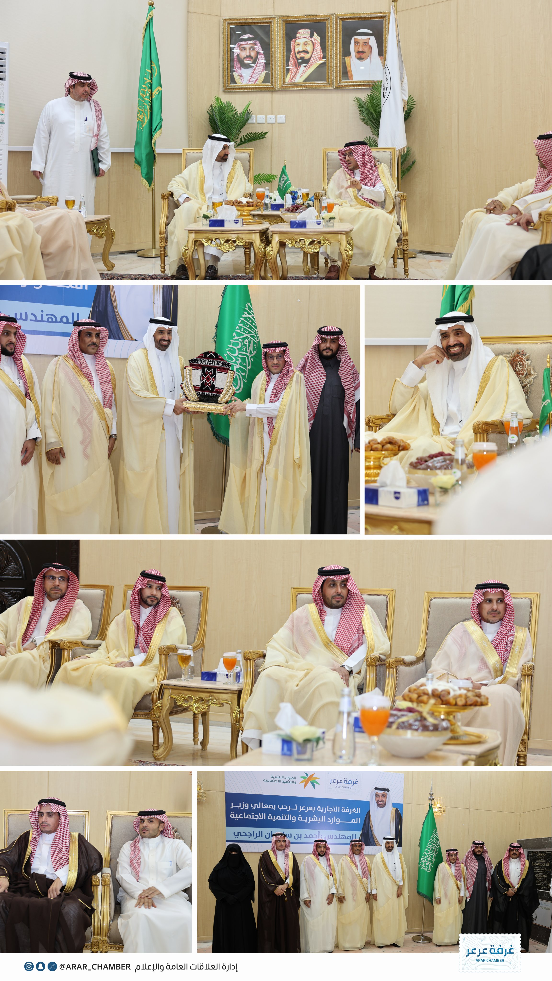 استقبل سعادة رئيس الغرفة التجارية بمنطقة الحدود الشمالية الاستاذ أحمد بن صالح السويلم معالي وزير الموارد البشرية والتنمية الاجتماعية المهندس أحمد بن سليمان الراجحي والوفد المرافقة له بحضور أعضاء مجلس ادارة الغرفة.