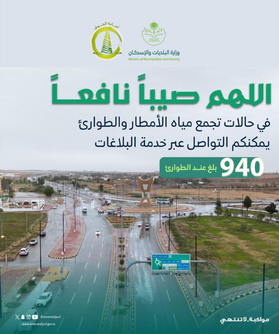 تعمل فـرق الطوارئ بـأمانة منطقة الجوف وبلدياتها على مدار الساعة للتدخل السريع في حالة حـدوث أي تجمع لمياه الأمطار، وتـسعد بتلقى جميع البلاغات على الرقم 940