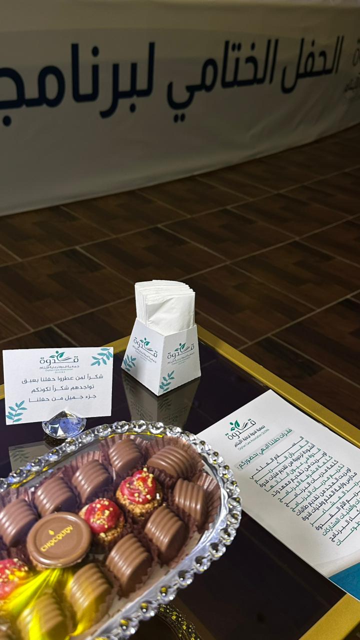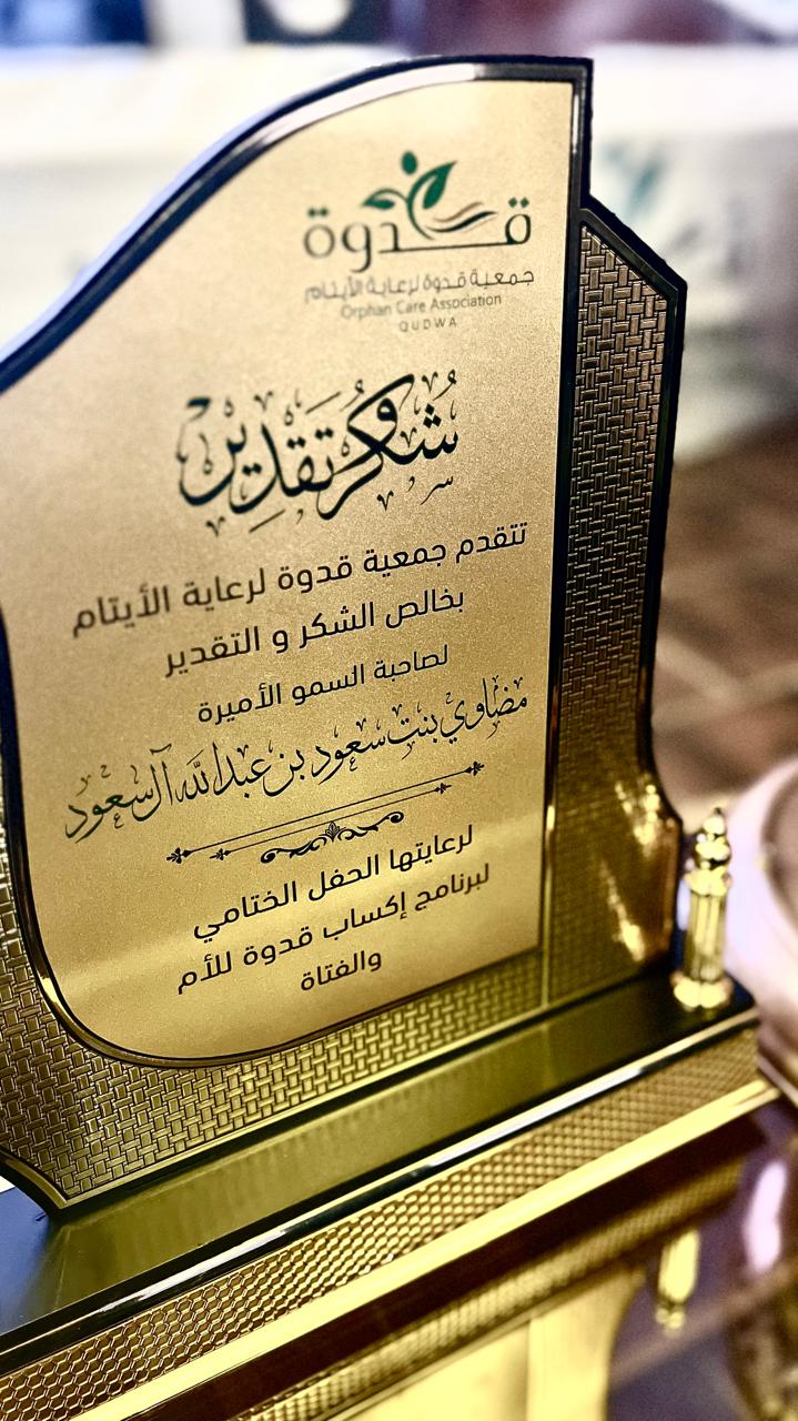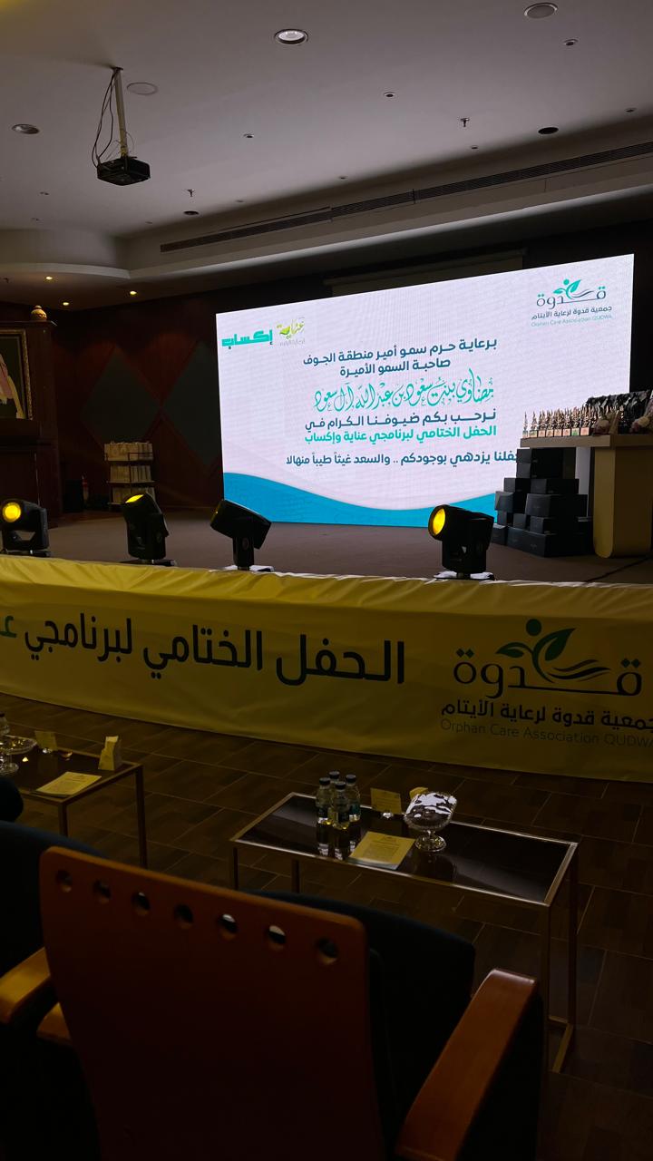 اختتمت جمعية قدوة لرعاية الأيتام برنامجي "عناية" و "إكساب"، تحت رعايه صاحبه السمو الأميرة مضاوي بنت سعود بن عبدالله آل سعود، و بحضور عدد من سيدات و إعلاميات منطقة الجوف و امهات و فتيات جمعية قدوة، بحضور فاق عدده ٢٣٠.