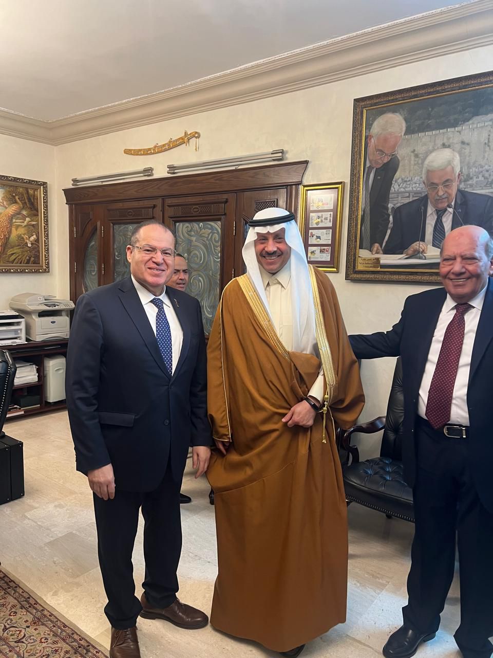 سلم سفير خادم الحرمين الشريفين لدى المملكة الأردنية الهاشمية الشقيقة وغير المقيم لدولة فلسطين الشقيقة نايف بن بندر السديري اليوم فخامة رئيس دولة فلسطين محمود عباس دعوة من أخيه خادم الحرمين الشريفين الملك سلمان بن عبدالعزيز حفظه الله لحضور قمةالمتابعةالعربيةالإسلاميةالمشتركة التي ستقام في الرياض الأسبوع القادم.