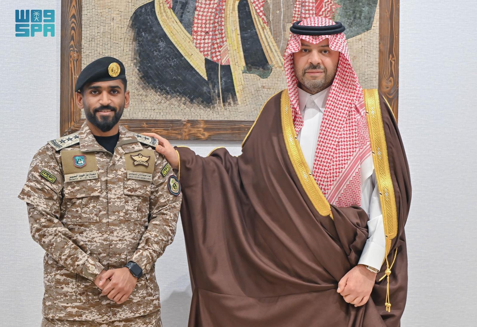 قلد صاحب السمو الملكي الأمير فيصل بن خالد بن سلطان بن عبدالعزيز، أمير منطقة الحدود الشمالية، في مكتبه اليوم، ضابط القوة الخاصة للأمن الدبلوماسي المرافق لسموه معاذ بن فهد السبر، رتبته الجديدة بعد صدور الأمر الملكي الكريم بترقيته إلى رتبة نقيب.