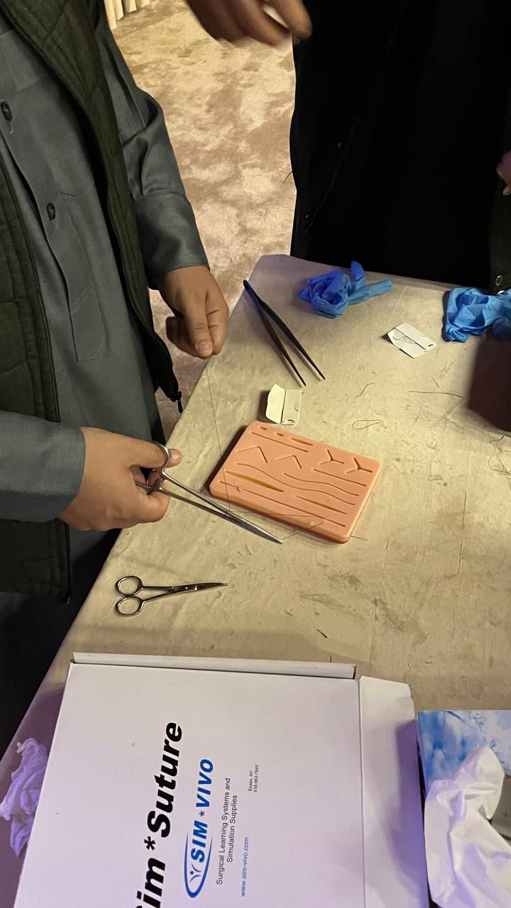 كما تحدث بشكل عملي عن طريقة الخياطة الجراحيةحيث تستهدف المحاضرة طلاب الكليات الصحية وفي نهاية المحاضرة تم تقسيم الحضور الى مجموعات وتم تطبيق عملي.