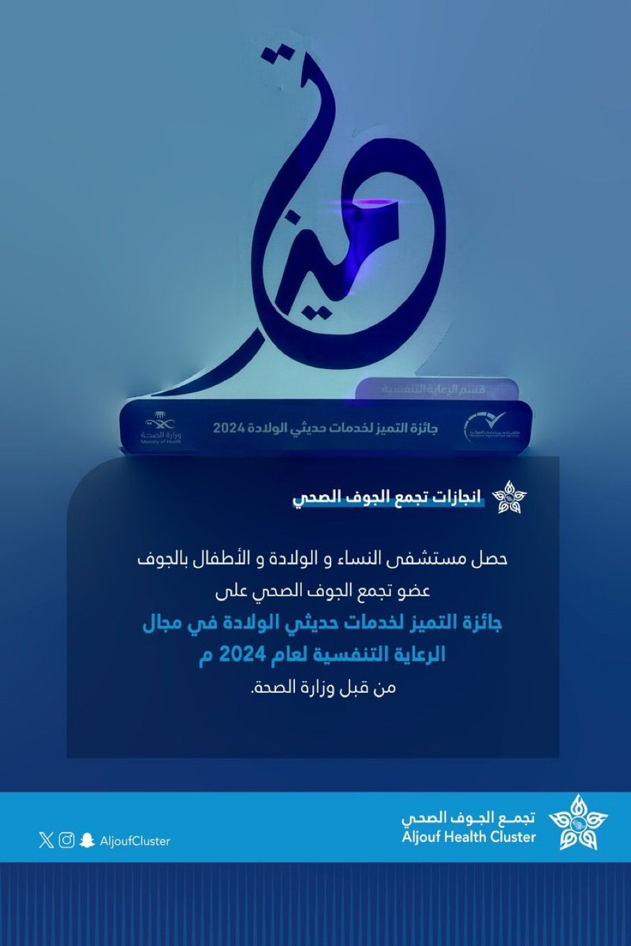 حصل مستشفى النساء والولادة والأطفال بالجوف عضو تجمع الجوف الصحي على جائزة التميز لخدمات حديثي الولادة في مجال الرعاية التنفسية من قبل وزارة الصحة لعام 2024.