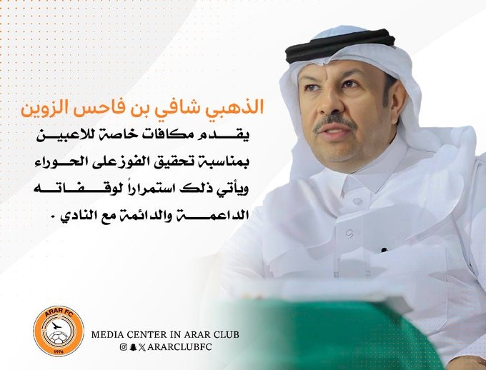 من جهته قدّم عضو نادي عرعر الذهبي رجل الأعمال : شافي بن فاحس الزوين مكافآت خاصة للاعبي الفريق الأول لكرة القدم نظير فوزهم في المباراة ، و قدم مجلس إدارة نادي عرعر شكره وتقديره للذهبي الزوين مثمناً هذه الوقفة غير المستغربة منه والتي تأتي استمرارًا لدعمه المتواصل واستكمالاً لمواقفة الدائمة والداعمة مع ناديه .