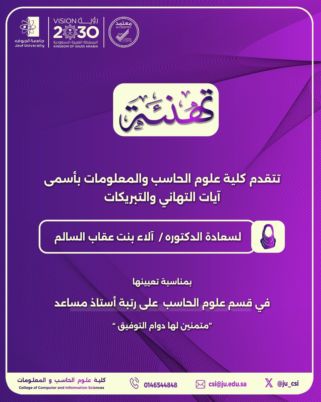 صدر قرار رئيس جامعة الجوف الأستاذ الدكتور محمد بن عبدالله الشايع تعيين الدكتوره آلاء بنت عقاب السالم، على رتبة أستاذ مساعد في قسم (علوم الحاسب)،في كلية علوم الحاسب والمعلومات بالجامعة .
