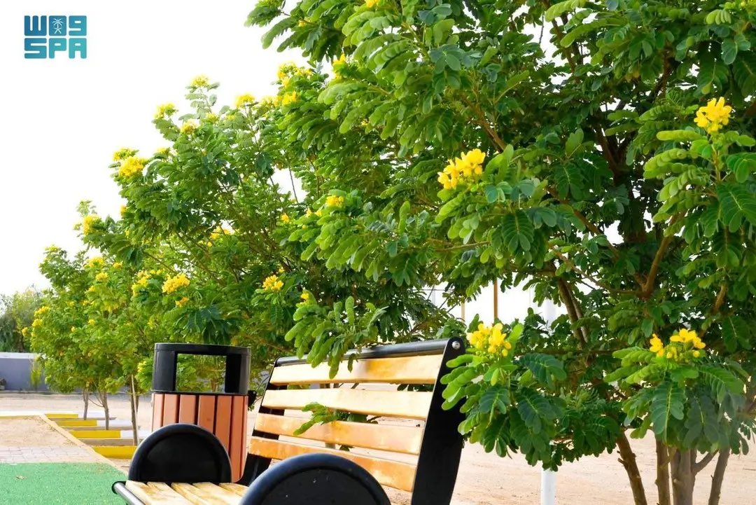 زينت أشجار الأكاسيا منتزهات وحدائق قرى منطقة الحدود الشمالية راسمة لوحة كرنفالية من الألوان الطبيعية الذهبية.