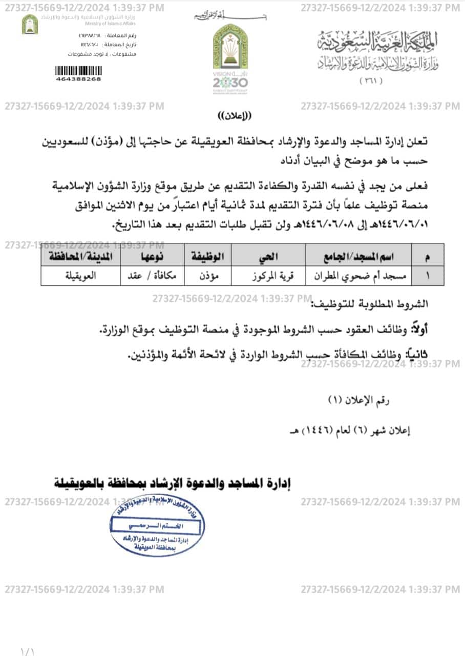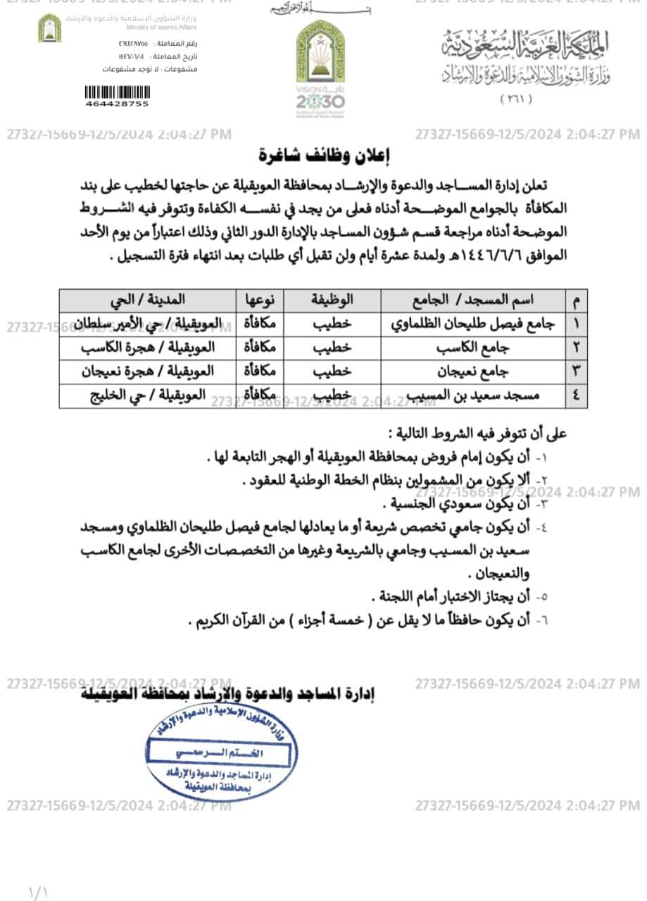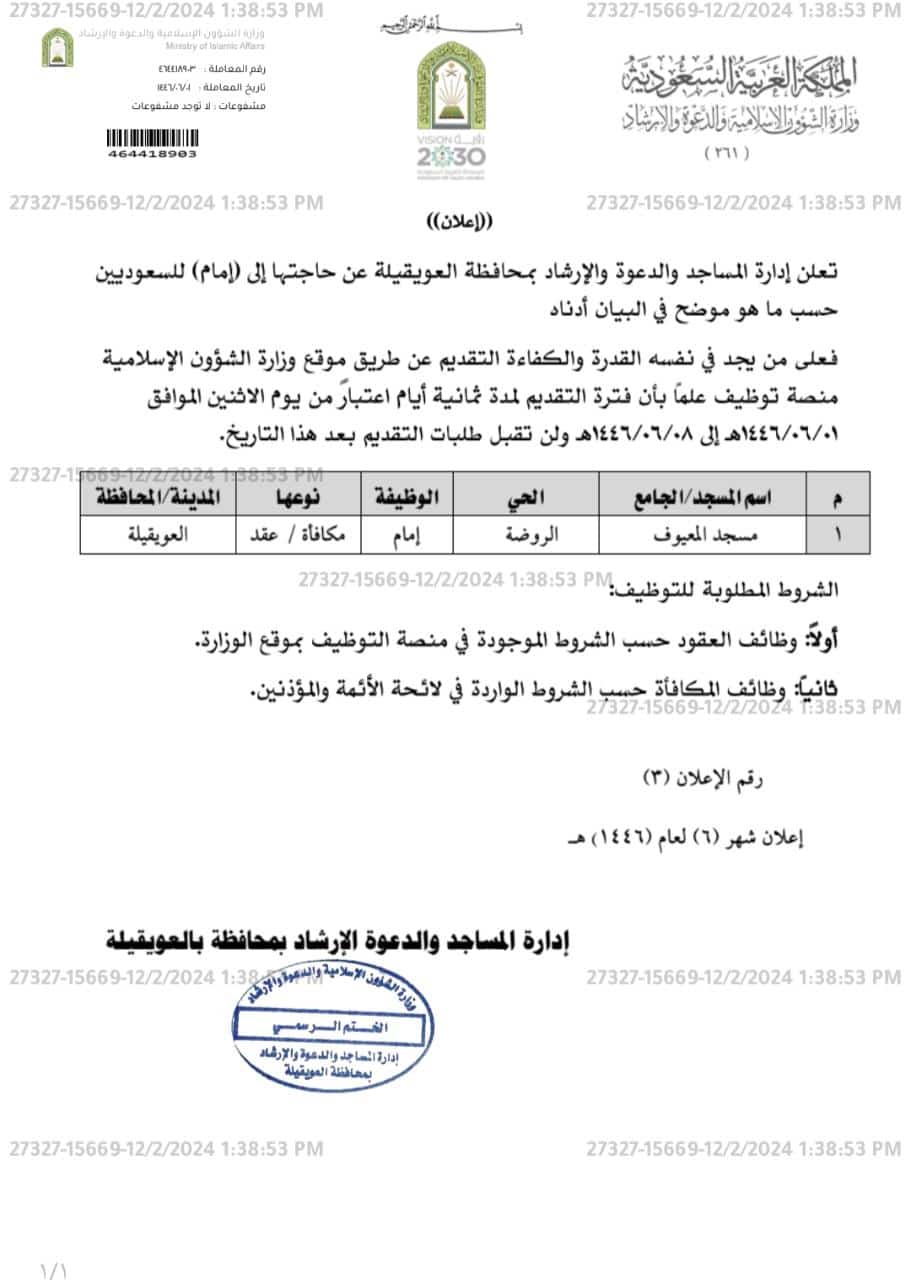 تعلن ادارة المساجد والدعوة والارشاد بمحافظة العويقيلة عن عدد من الوظائف إمام والمؤذن سواءاً كانت عقد أو نظام المكافاءات في عدد من المساجد ( مسجد المعيوف - حي الروضة - إمام ) و ( مسجد أم ضحوي المطران - حي قرية المركوز - مؤذن ) في العويقيلة والمركوز ومدة التقديم ثمانية أيام إبتداء من يوم الاثنين الموافق ٠١ / ٠٦ / ١٤٤٦ هـ إلى ٠٨ / ٠٦ / ١٤٤٦ هـ .