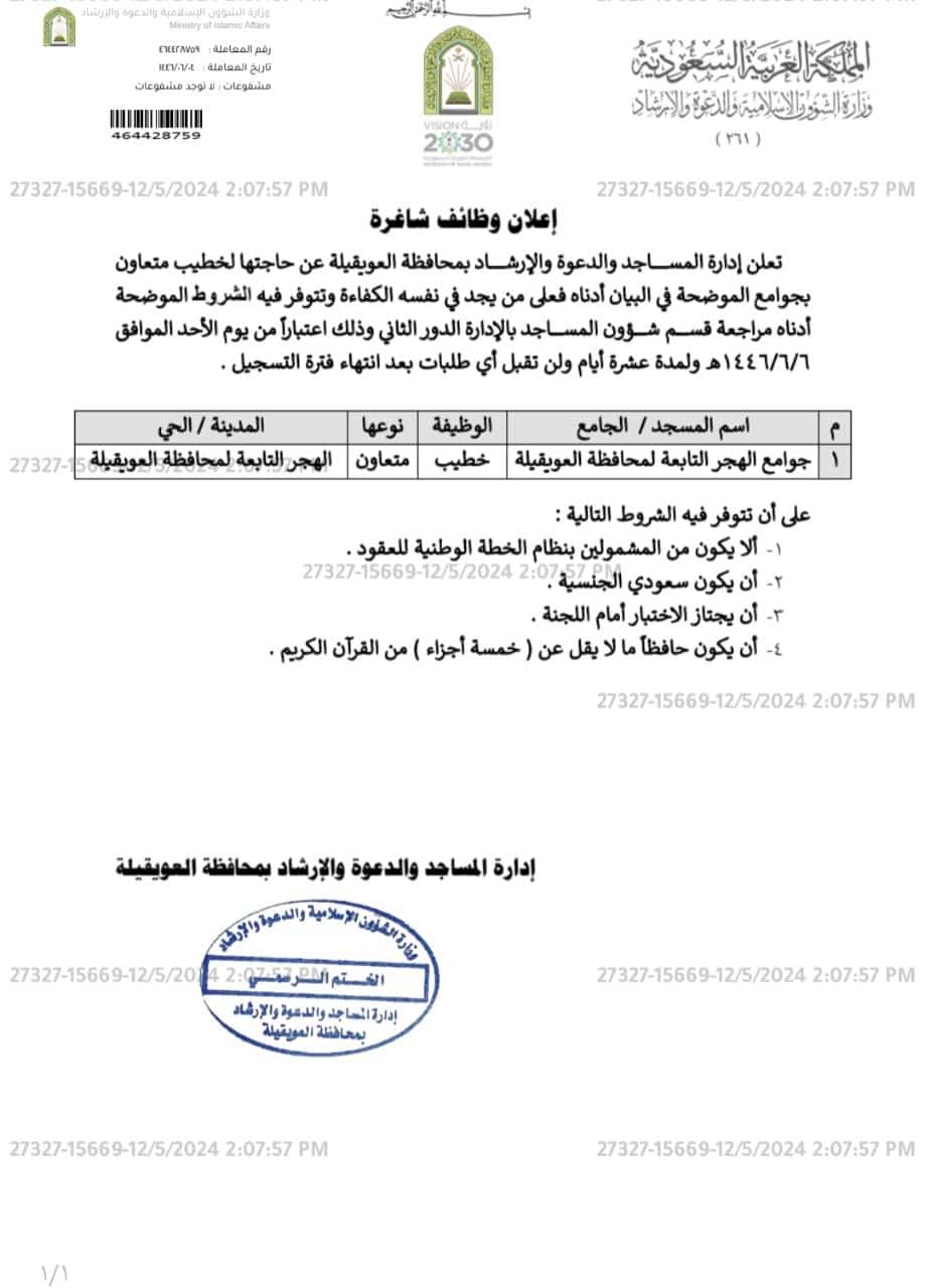 كما اوضح مدير ادارة المساجد والدعوة والإرشاد بمحافظة العويقيلة حمد بن سليمان المايق من يجد بنفسه الكفاءة في التقديم ايضاً على خطيب جمعة جمعة ( رسمي - متعاون ) في عدد من مساجد العويقيلة والقرى التابعة لها ( جامع فيصل طليحان الظلماوي رحمه الله - جامع هجرة الكاسب - جامع هجرة نعيجان - جامع سعيد بن المسيب ) اما بشأن جوامع الهجر التابعة للمحافظة خطيب متعاون التقديم يكون في قسم المساجد في الادارة ابتداء من يوم ٠٣ / ٠٦ / ١٤٤٦ هـ الى الموافق ١٠ / ٠٦ / ١٤٤٦ هـ .
