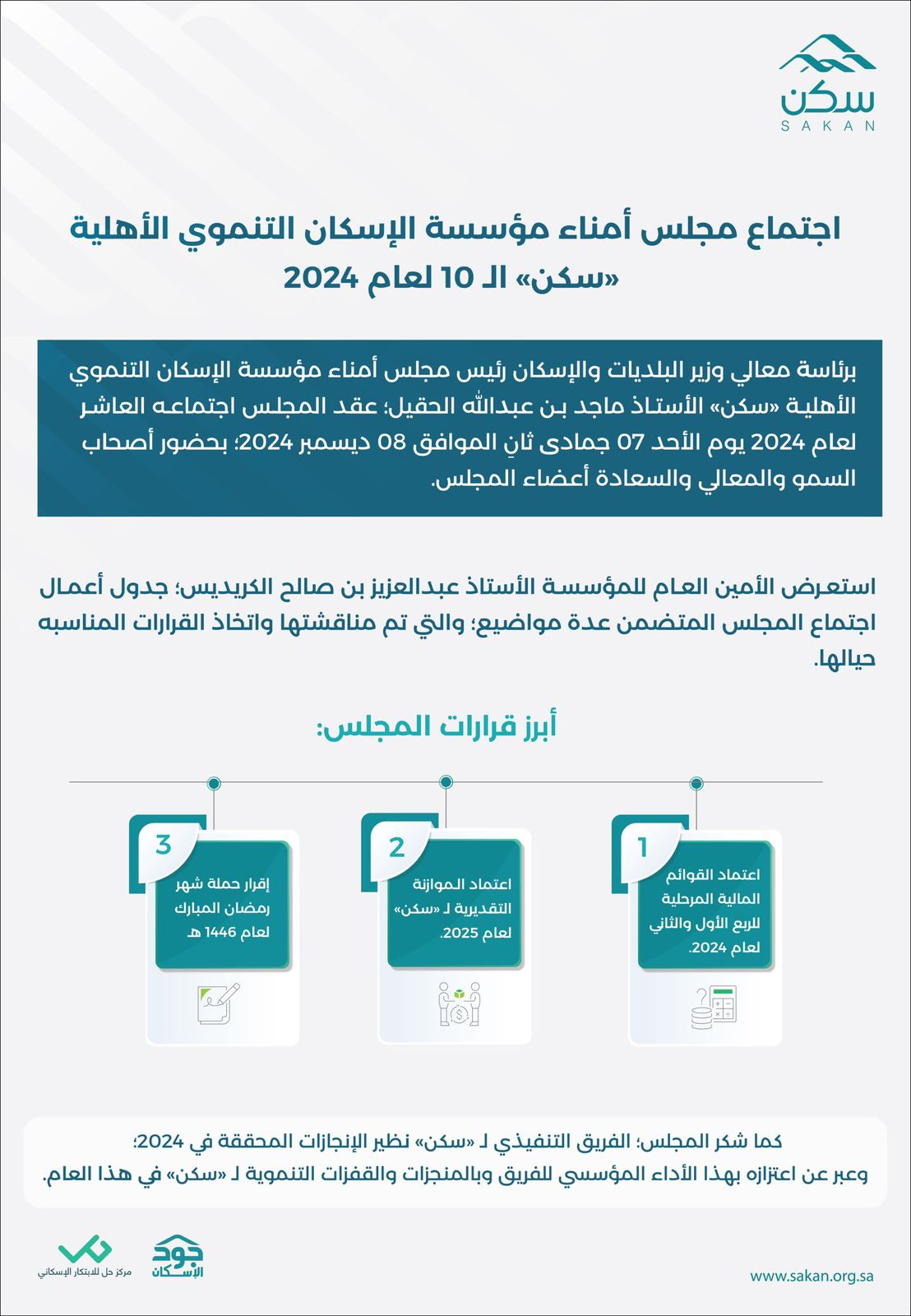 كما عبر المجلس؛ عن شكره للفريق التنفيذي لـ "سكن"؛ نظير الإنجازات المحققة في 2024؛ واعتزاز الأعضاء بهذا الأداء المؤسسي للفريق وبالمنجزات والقفزات التنموية لـ "سكن" في هذا العام.