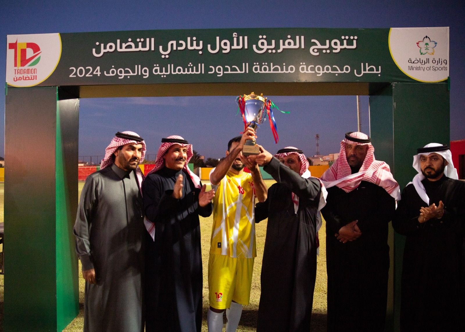 توج مساعد مدير فرع وزارة الرياضة بمنطقة الحدود الشمالية خميس بن رضيمان العنزي فريق التضامن بكأس دوري منطقتي الجوف والحدود الشمالية بعد فوزه على فريق الانطلاق ، بثلاثة أهداف مقابل هدف ، كان الانطلاق البادي بالتسجيل في الدقيقة 35 من الشوط الأول ولم تكتمل فرحة الانطلاق بالهدف حتى عدّل التضامن النتيجة بعدها بدقيقتين ، وبه انتهى الشوط الأول ، وأحرز التضامن هدفي الفوز في الدقيقة 10-20 في الشوط الثاني ، وبعد المباراة تتم التتويج ، وكانت فرق التضامن وطبرجل والقريات قد حسمت التأهل لتصفيات المملكة في الجولة السابقة .، ومن جهته كرمت إدارة التضامن بين شوطي المباراة الإعلاميين عيادة الجنيدي ، وعودة المهوس نظيره جهودهما الإعلامية في متابعة ونشر أخبار النادي .