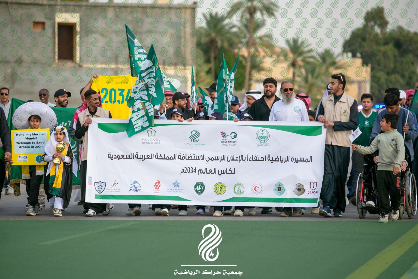 أطلقت جمعية حراك الرياضية بمنطقة الجوف مسيرة رياضية للمشي بمناسبة فوز المملكة باستضافة كأس العالم 2034 , وذلك على الممشى الذي يربط طريق الملك سعود بمنتزه القرعا الجبلي في سكاكا.