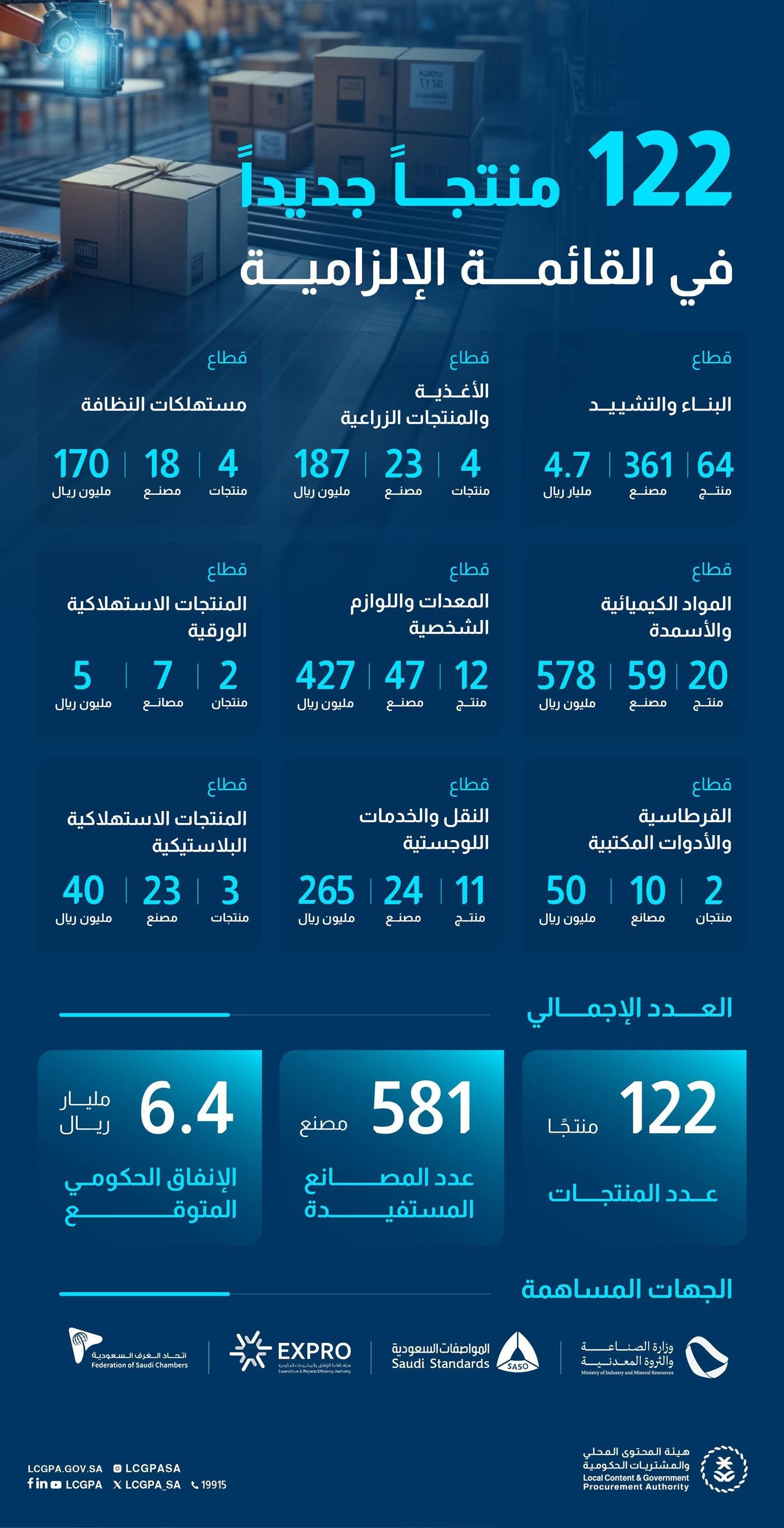 أعلنت هيئة المحتوى المحلي والمشتريات الحكومية إصدار تحديث للقائمة الإلزامية، من خلال إضافة 122 منتجًا وطنيًا، تشمل 9 قطاعات مختلفة، حيث سيبدأ تطبيقها من جانب الجهات الحكومية ابتداءً من تاريخ 1 مارس 2025م، كما سيبدأ اشتراط وجود شهادة المحتوى المحلي ابتداءً من تاريخ 1 سبتمبر 2025م.