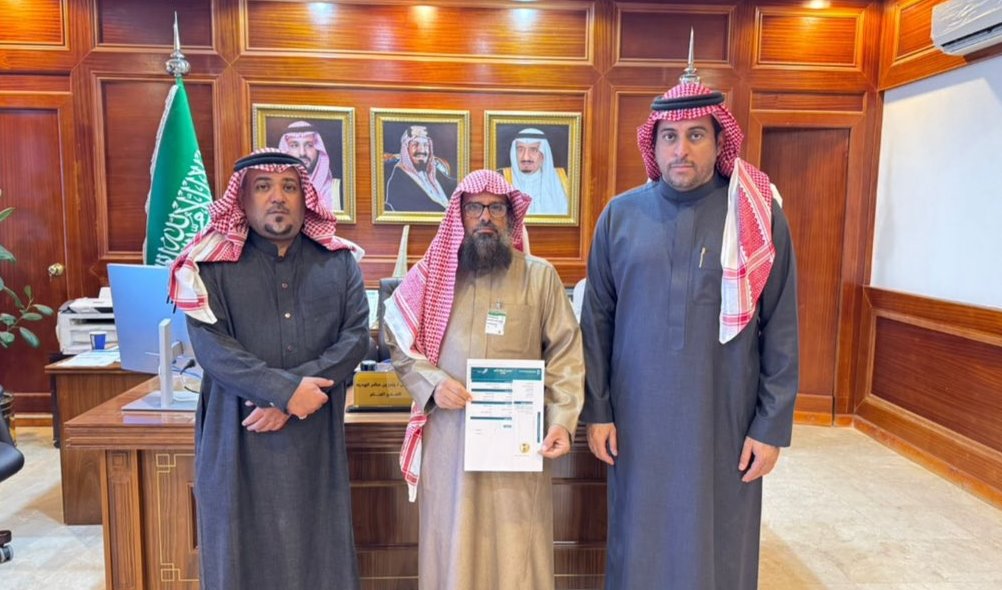 سلم مدير عام فرع وزارة البيئة والمياه والزراعة بمنطقة الحدود الشمالية المهندس بندر بن صالح الهديه بحضور مدير إدارة الأسواق والمسالخ الدكتور أحمد الياس المواطن صالح الطرقي العنزي أول ترخيص الكتروني مقدم خدمة التسويق دلال بأسواق النفع العام بالمنطقة الصادرة من منصة نما الإلكترونية