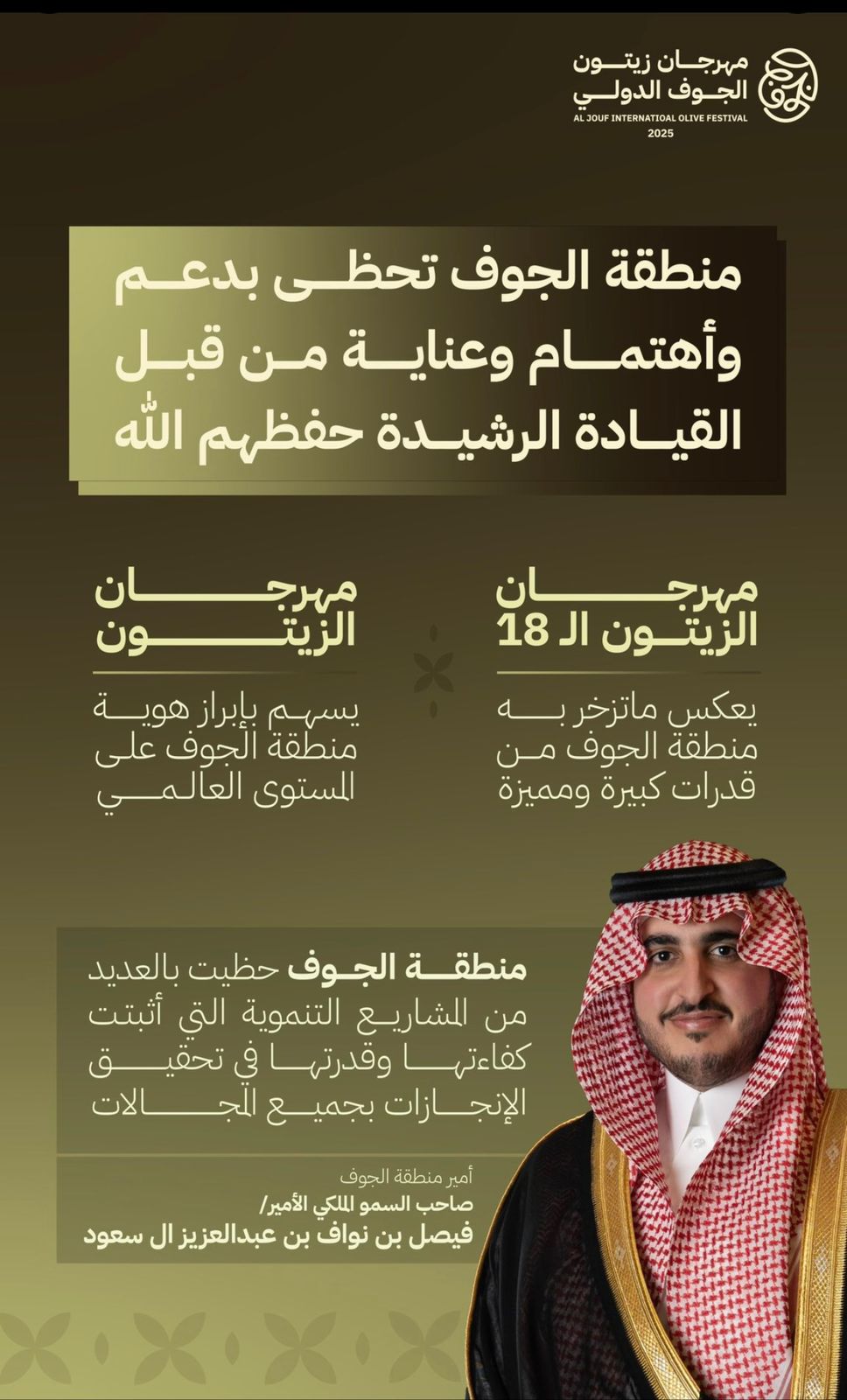 في مهرجان الزيتون بالجوف في نسخته الثامنة عشر، وفي وسط حفل أسطوري، استقبل سمو الأمير فيصل بن نواف، أمير منطقة الجوف، استقبالًا حارًا من الأهالي. حيث عبروا عن مشاعرهم بالتصفيق والتصفير وتشكيل القلوب بأيديهم، واستقبل سموه ذلك بابتسامته المعهودة، التي تبرز الأثر العظيم الذي أحدثه في المنطقة.