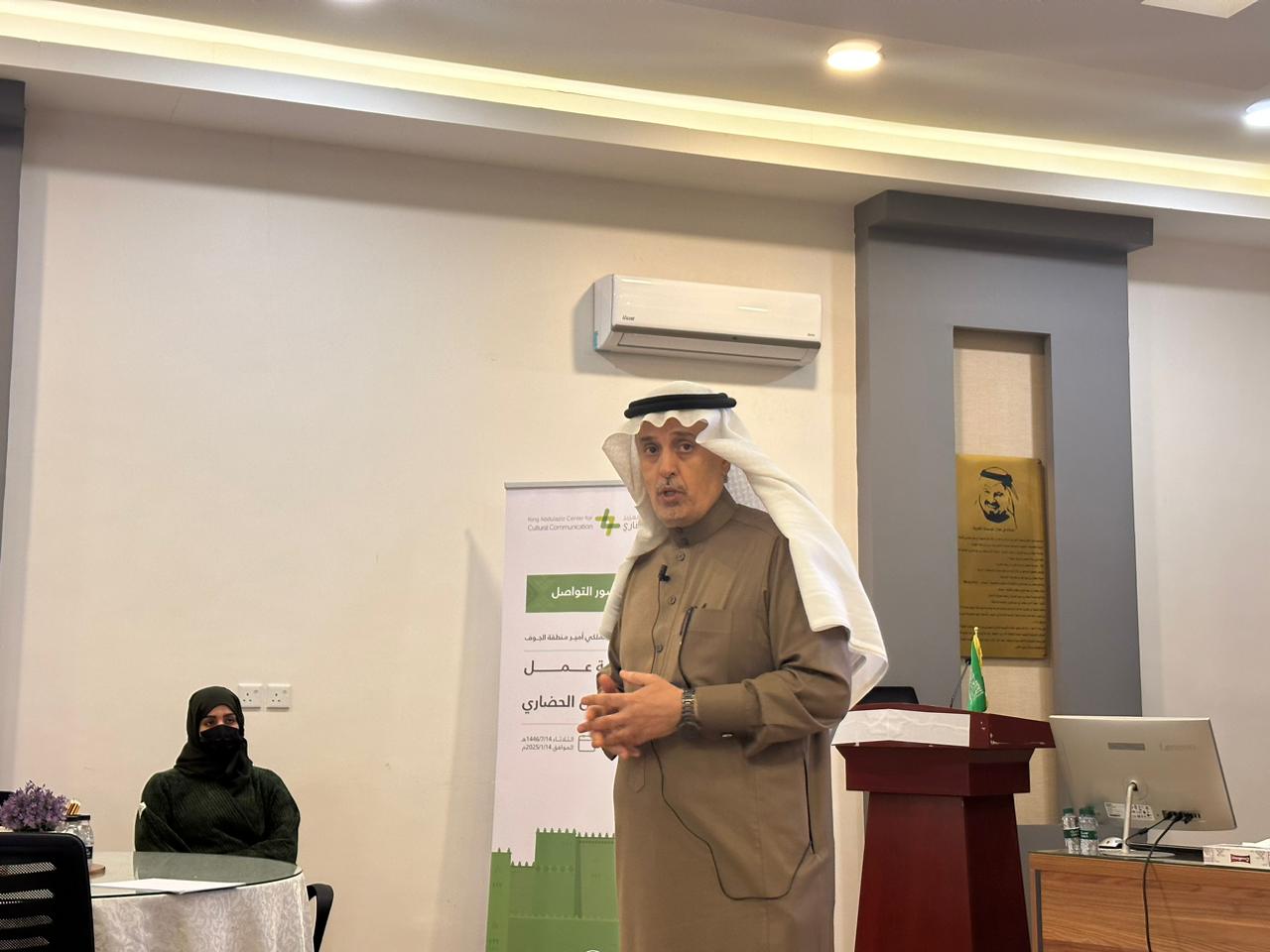 كما ألقى أ. إبراهيم العاصمي كلمة تحدث فيها عن الخطة الاستراتيجية للمركز والتي كانت انطلاقتها من أرض الجوف وجهود المملكة في التواصل الثقافي والحضاري .