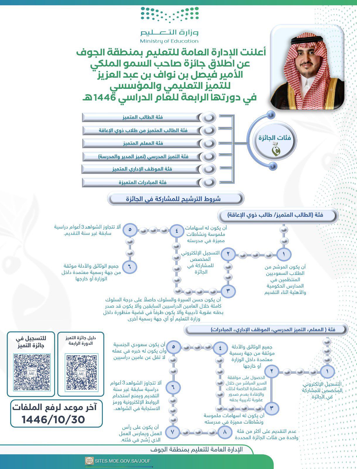 أعلنت الإدارة العامة للتعليم بمنطقة الجوف عن إطلاق جائزة الأمير فيصل بن نواف بن عبدالعزيز للتميز التعليمي والمؤسسي في دورتها الرابعة للعام الدراسي 1446هـ.