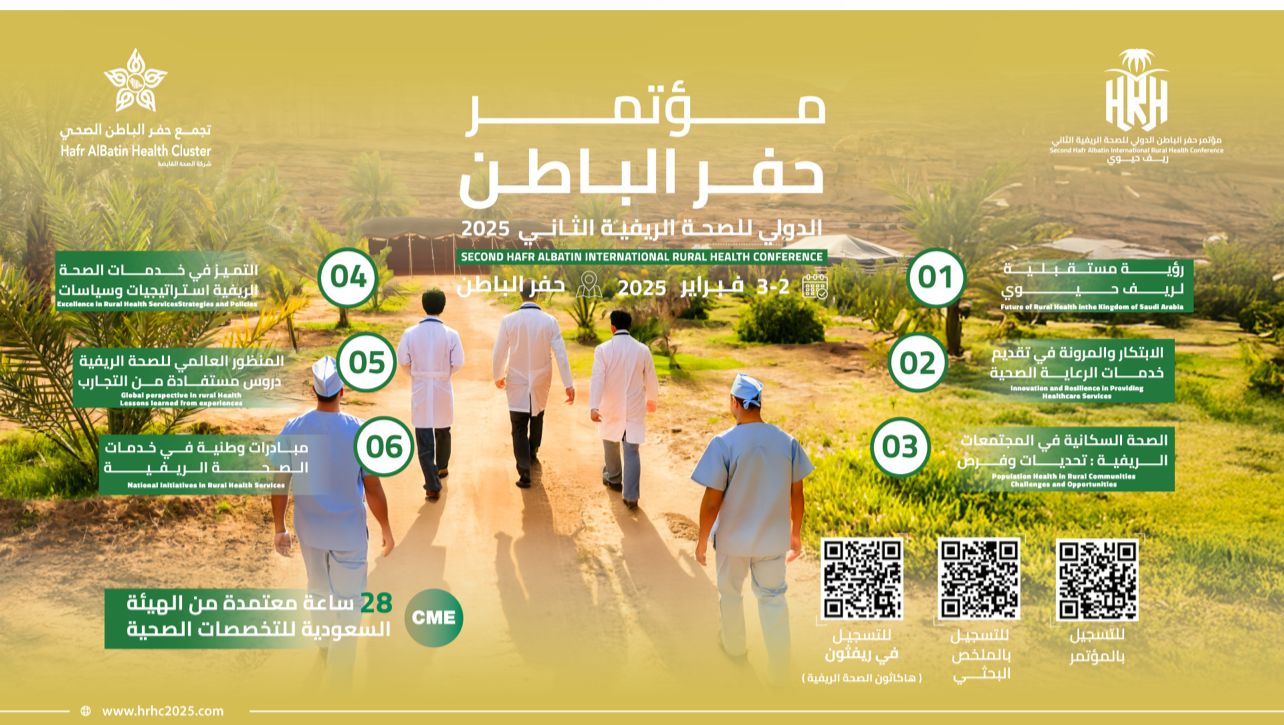يُنظّم تجمع حفر الباطن الصحي يومي 2 – 3 فبراير 2025 م, مؤتمر حفر الباطن الدولي للصحة الريفية في نسخته الثانية تحت شعار "ريف حيوي", بمشاركة العديد من الجهات المحلية والدولية.