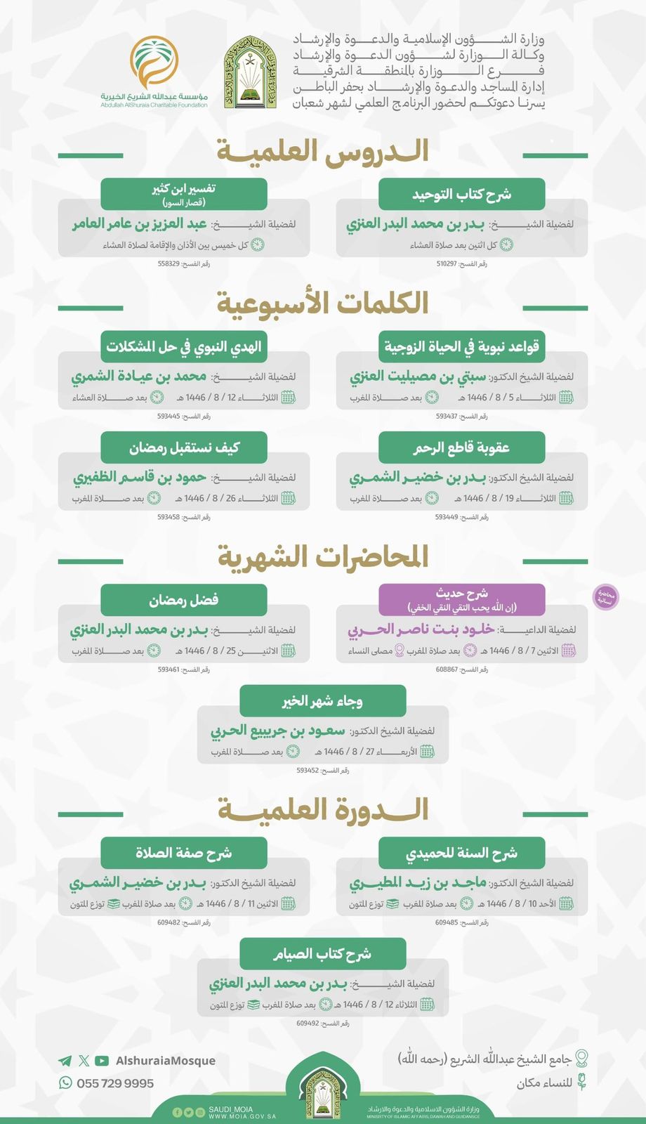 وستقام ــ بإذن الله ــ الدروس والمحاضرات والدورات العلمية والكلمات في عدد من الجوامع والمساجد بالمحافظة و للنساء مكان مخصص.