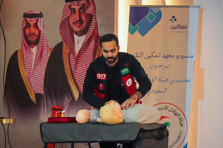 وفي هذا الإطار، قام فرع الهيئة بتدريب منسوبي معهد تمكين التقني، حيث قدم فريق مختص من الهلال الأحمر برنامجًا تدريبيًا حول أساسيات الإسعافات الأولية، مثل التعامل مع الإغماء، الإنعاش القلبي الرئوي، وإسعاف الإصابات المختلفة، إضافة إلى التدريب على استخدام أجهزة مزيل الرجفان الآلي (AED)، إلى جانب تطبيقات عملية لضمان استيعاب المشاركين لكيفية التصرف السليم في الحالات الطارئة. وقد استفاد من التدريب أكثر من 50 مشاركًا، الذين أشادوا بأهميته في تحسين مهاراتهم الإسعافية.