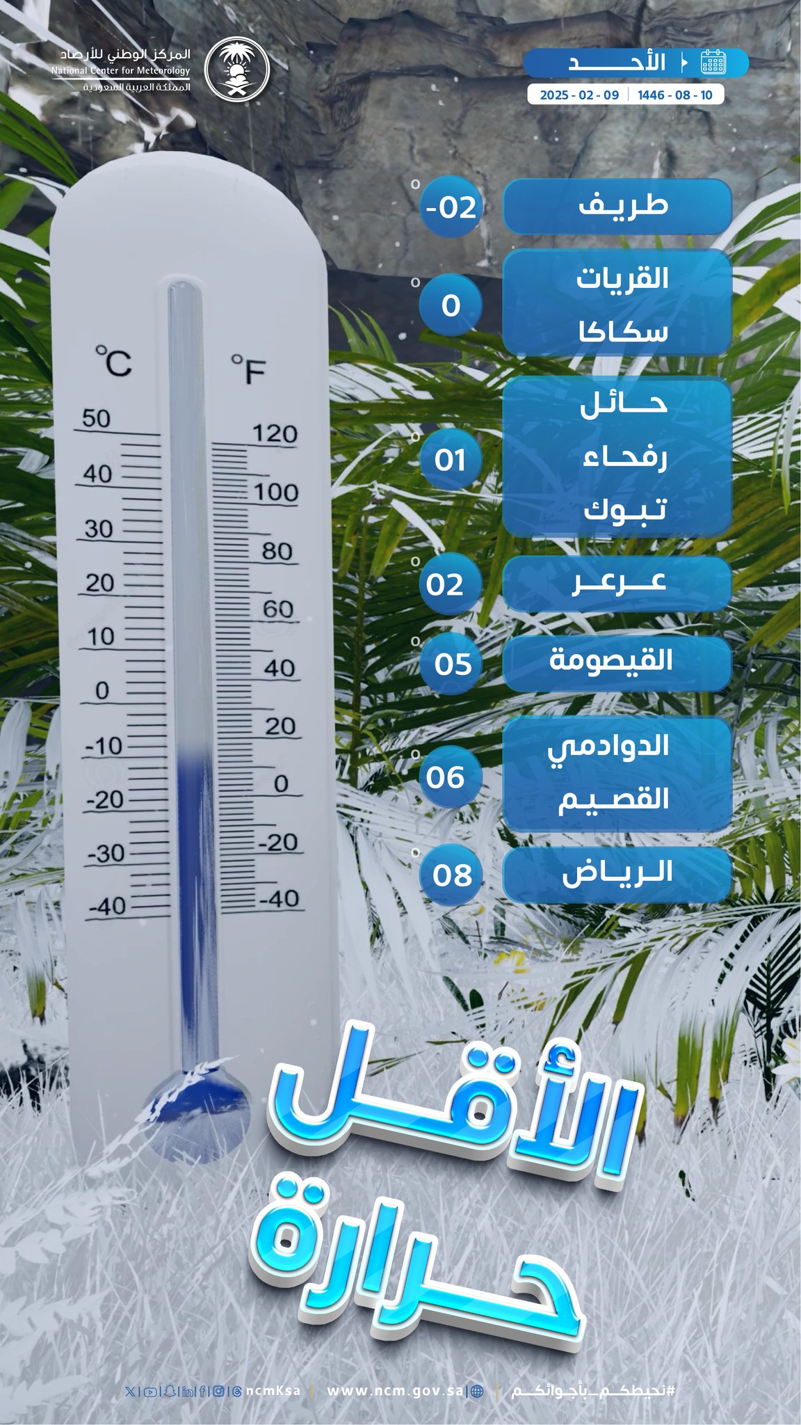 من جانبه، نبّه المركز الوطني للأرصاد من تأثر محافظة طريف بكتلة هوائية شديدة البرودة، تبدأ من اليوم وتستمر حتى نهاية الأسبوع، متوقعًا أن تتراوح درجات الحرارة الصغرى ما بين صفر و 3 درجات تحت الصفر، ما يستدعي اتخاذ الاحتياطات اللازمة لمواجهة تداعيات هذه الأجواء الباردة.