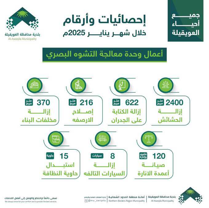 نفّذت بلدية محافظة العويقيلة، التابعة لأمانة منطقة الحدود الشمالية، عدداً من الأعمال الميدانية خلال شهر يناير 2025، وذلك ضمن جهودها في معالجة التشوه البصري وتحسين المشهد الحضري في جميع أحياء المحافظة.