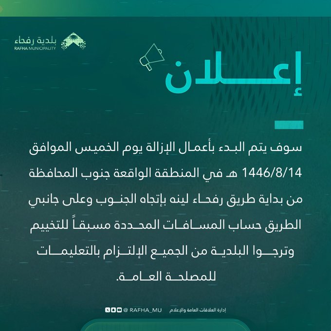 أعلنت بلدية محافظة رفحاء عن بدء أعمال الإزالة يوم الخميس الموافق 14/8/1446هـ في المنطقة الواقعة جنوب المحافظة، وذلك ابتداءً من طريق رفحاء - لينة باتجاه الجنوب، وعلى جانبي الطريق وفق المسافات المحددة مسبقًا للتقييم.