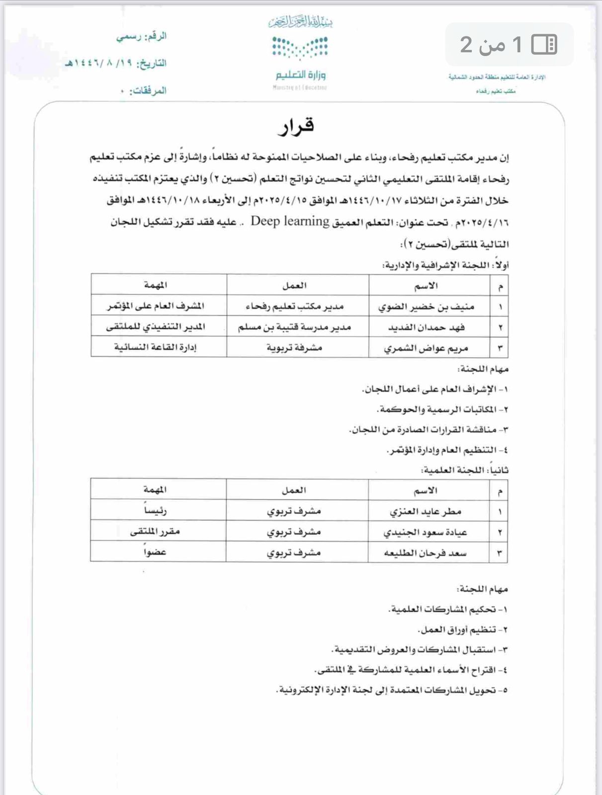 ناقش الاجتماع توزيع المهام والأدوار بين الأعضاء، كما تم إصدار قرارات التكليف لضمان جاهزية الملتقى وتحقيق أهدافه التعليمية والتقنية. ويأتي هذا الاجتماع في إطار الاستعدادات المكثفة لتنظيم الملتقى، الذي يسعى إلى تعزيز أساليب التعلم العميق وتطوير الممارسات التربوية الحديثة.