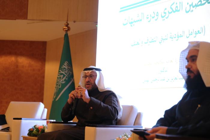بعد ذلك وتحت عنوان: "التحصين الفكري ودرء الشبهات" تحدث الأستاذ الدكتور عبدالعزيز الهليل في محاضرته مبينًا أن الإنسان يمر بعدة مراحل فهو يبدأ إنسانًا سويًا والتطرف يطرأ نتيجة عدة عوامل ثم يأتي دور تأهيل الإنسان للخلاص مما وقع به، ثم تبدأ مرحلة التعافي والخروج من المأزق.