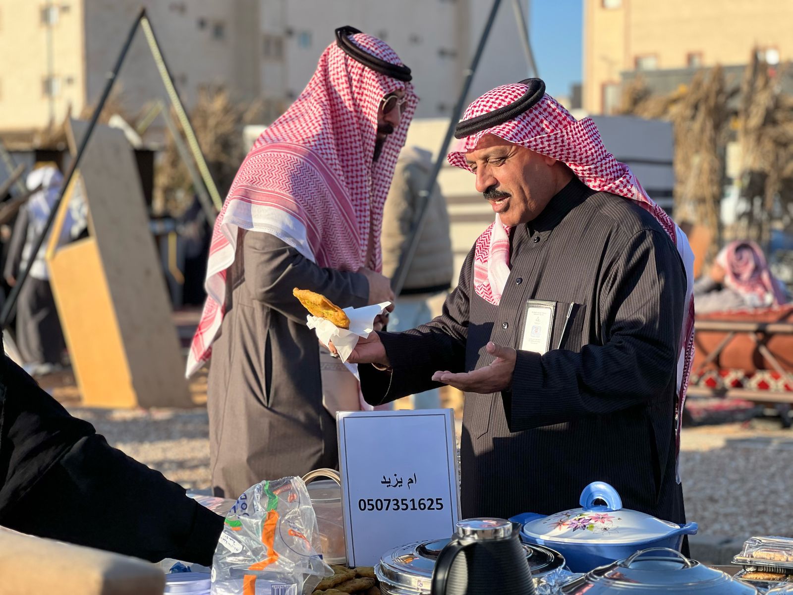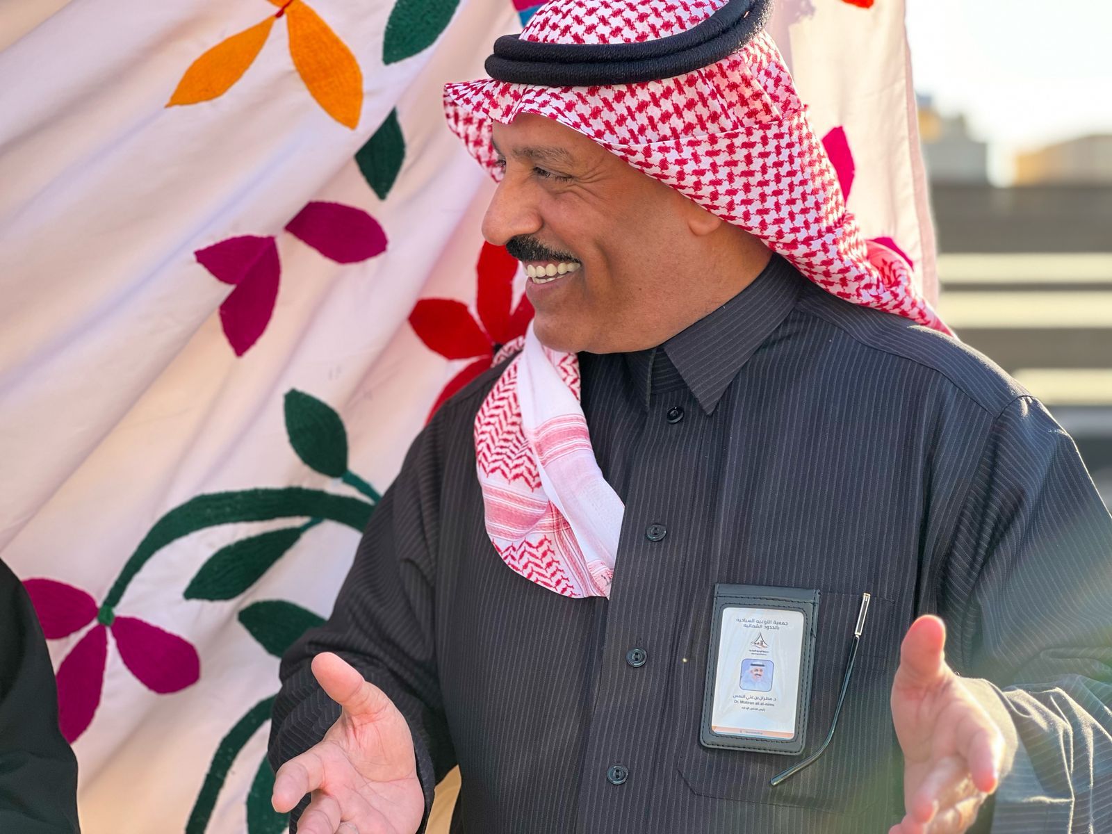بدعوة كريمة من جمعية المسؤلية الاجتماعية في الحدود الشمالية رئيس جمعية التوعية السياحية في منطقة الحدود الشمالية الدكتور مطيران علي النمس وعدد من أعضاء الجمعية يحضرون برنامج الاحتفاء بيوم التأسيس في مخيم عبية في مدينة عرعر وكان في استقبالهم رئيس جمعيةالمسؤلية الاجتماعية في الحدود الشمالية الأستاذة سبيته السويلمي والمدير التنفيذي الأستاذ ثامر العجران والأستاذ أحمد الشايع وقد تجول الدكتور النمس بحضور رجل الأعمال صبيح ملاهد مالك مخيم عبية داخل أركان المخيم واطلع على اركان الأسرة المشاركة وبعض البرامج والأنشطة التي أعدتها الجمعية .
