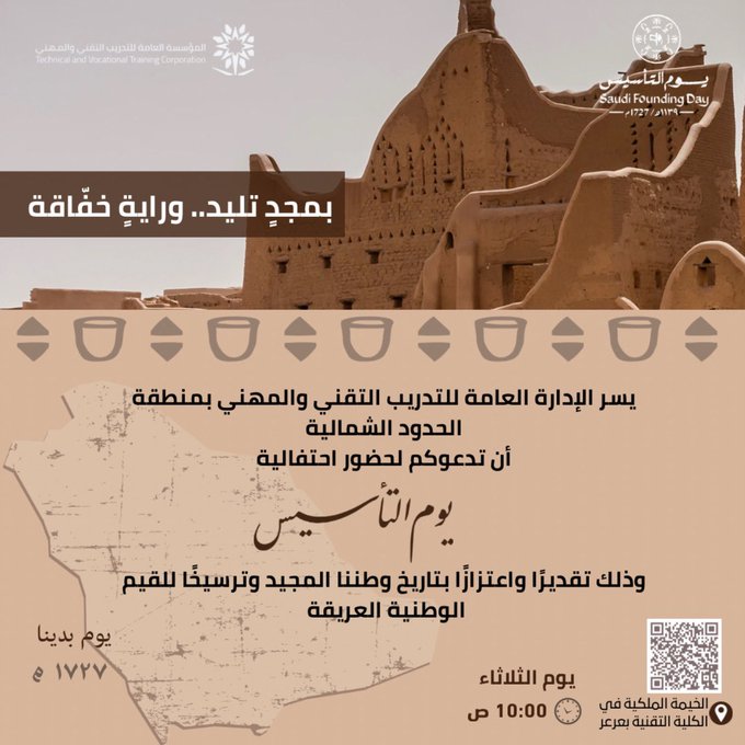 تقيم الإدارة العامة للتدريب التقني والمهني بمنطقة الحدود الشمالية فعاليات الاحتفاء بيوم التأسيس، وذلك يوم الثلاثاء 25 فبراير في الخيمة الملكية بالكلية التقنية بعرعر، في إطار تعزيز الهوية الوطنية واستذكار أمجاد التاريخ السعودي العريق.