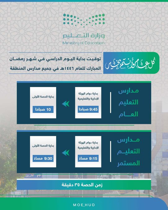 كما تم تحديد زمن الحصة الدراسية بـ 35 دقيقة، وذلك تماشيًا مع طبيعة الشهر الفضيل وتخفيفًا على الطلاب والطالبات.