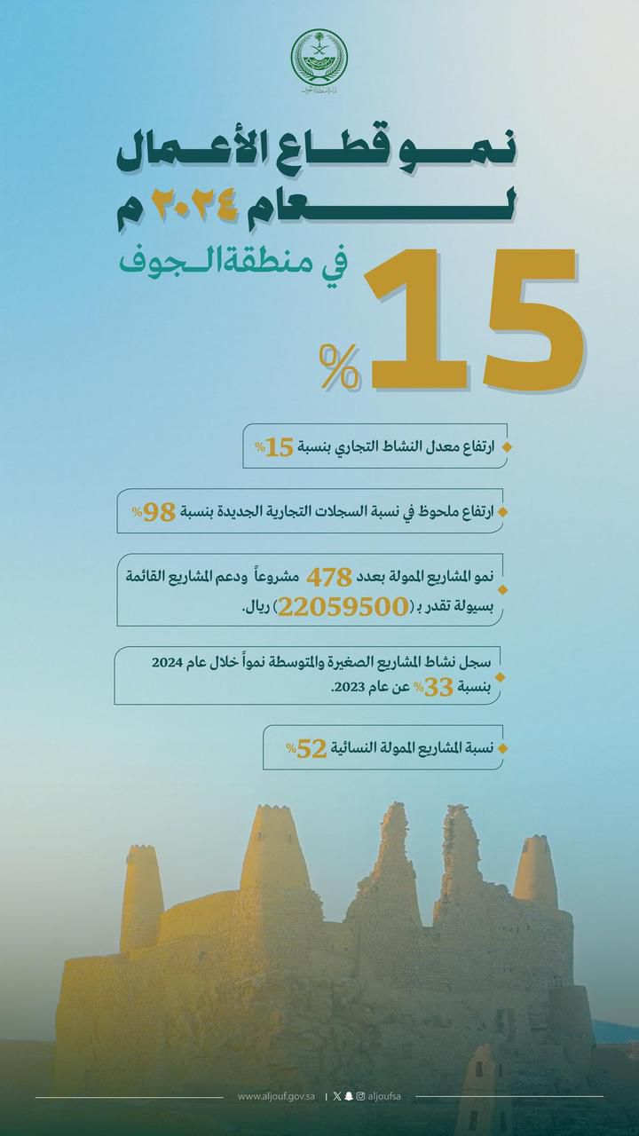 بجهود ومتابعة صاحب السمو الملكي الأمير فيصل بن نواف بن عبدالعزيز أمير منطقة الجوف، شهد قـطـاع الأعمال في منطقة الجوف نموًا ملحوظًا.