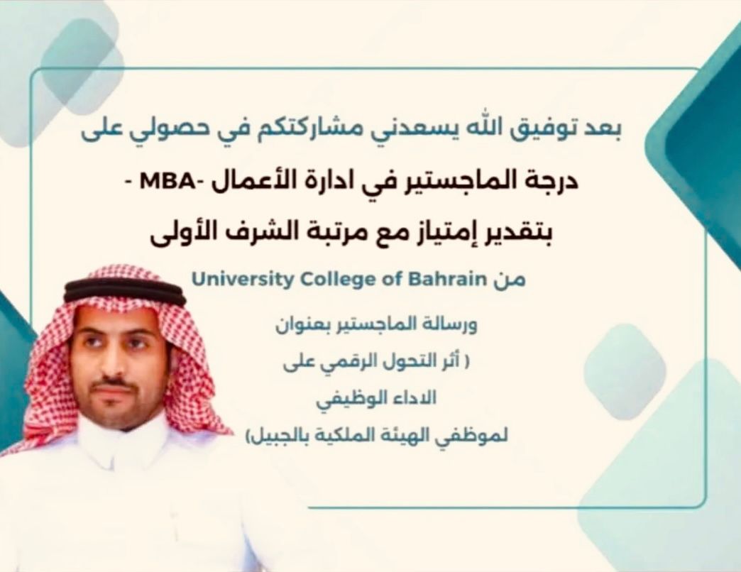 حصل الأستاذ محسن الرشيدي على درجة الماجستير في إدارة الأعمال -MBA- مع مرتبة الشرف الأولى من كلية البحرين الجامعية ، ورسالته تمت بعنوان ( اثر التحول الرقمي على الأداء الوظيفي لموظفي الهيئة الملكية بالجبيل ) علما ان الأستاذ محسن من منسوبي الهيئة الملكية بالجبيل وكان له أيادي بيضاء في خدمة طلاب الهيئة الملكية