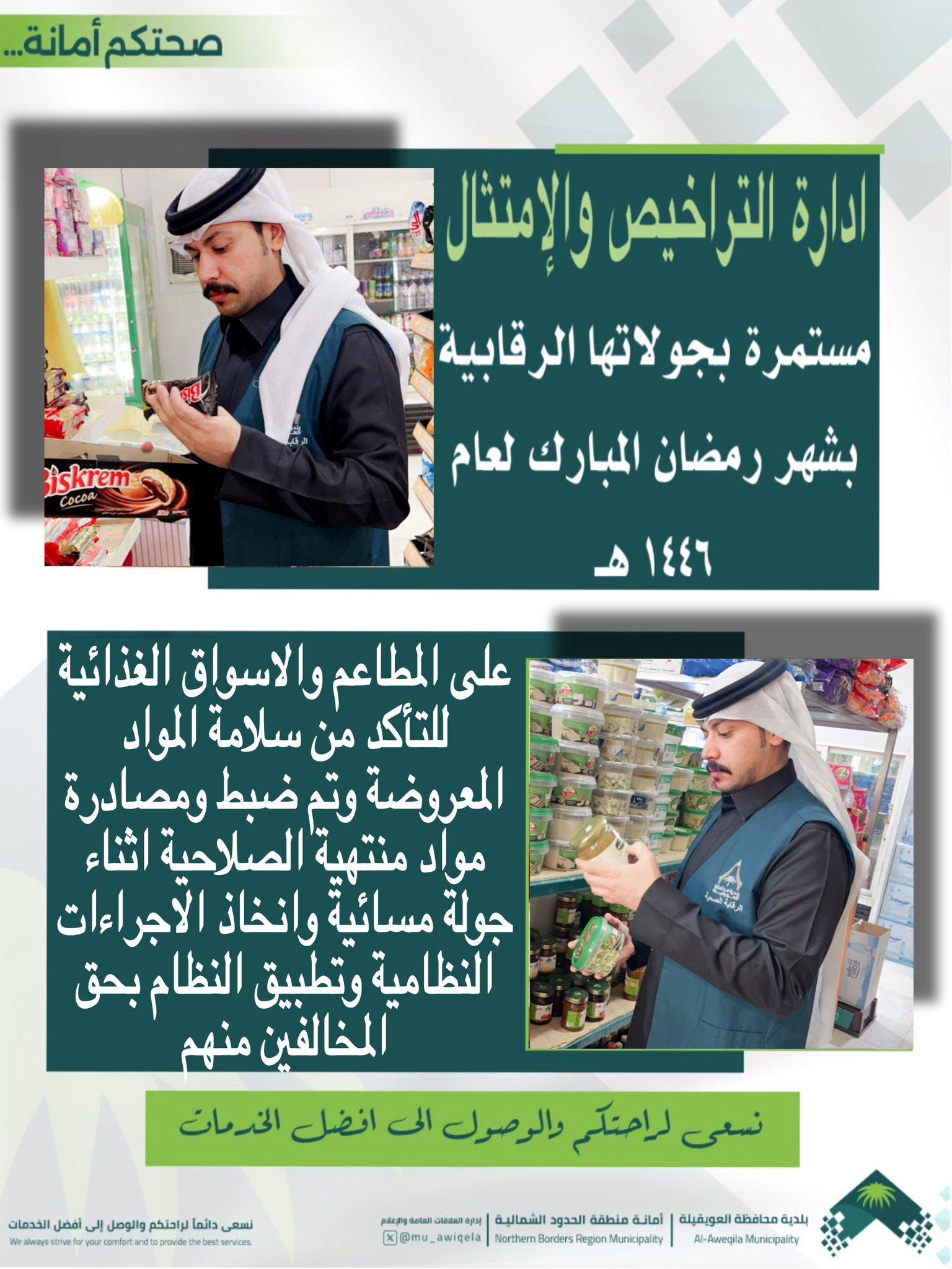 ادارة التراخيص والامتثال في بلدية محافظة العويقيلة تواصل جولاتها الرقابية بشكل مستمر على المطاعم والأسواق في المحافظة وذلك لهدف سلامة المواد المعروضة للمواطن .