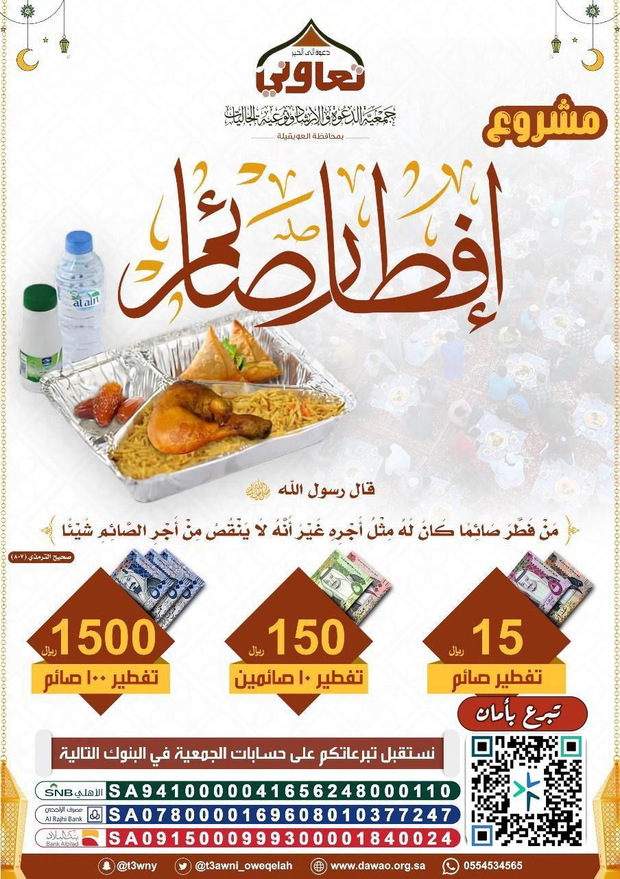 وفي هذا العام تم ولله الحمد إفطار (٣٠٢٣٤) صائم وفي وجبة السحور تم تقديم (٨٧٩٨) وجبة موزعة كاملة على المتواجدين في مواقع إفطار الصائمين التابع لجمعية الدعوة والإرشاد بالمحافظة وهي ثلاثة مواقع ١- جامع سمو الأمير ٢- مسجد الدعوة ٣- قرية المركوز . تحت إشراف مسؤولي الجمعية المكلفين .