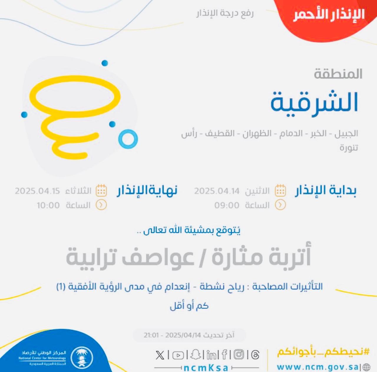 ايضا جاء هذا الخبر نتيجة تنبيه من المركز الوطني للأرصاد، بشأن وجود موجة غباريه محملة بالكثبان الرملية، التي من المتوقع ان تحجب الرؤية بالطرقات، وتؤثر على الصحة العامة،كما رفعت درجة الإنذار الأحمر على جميع محافظات ومدن المنطقة